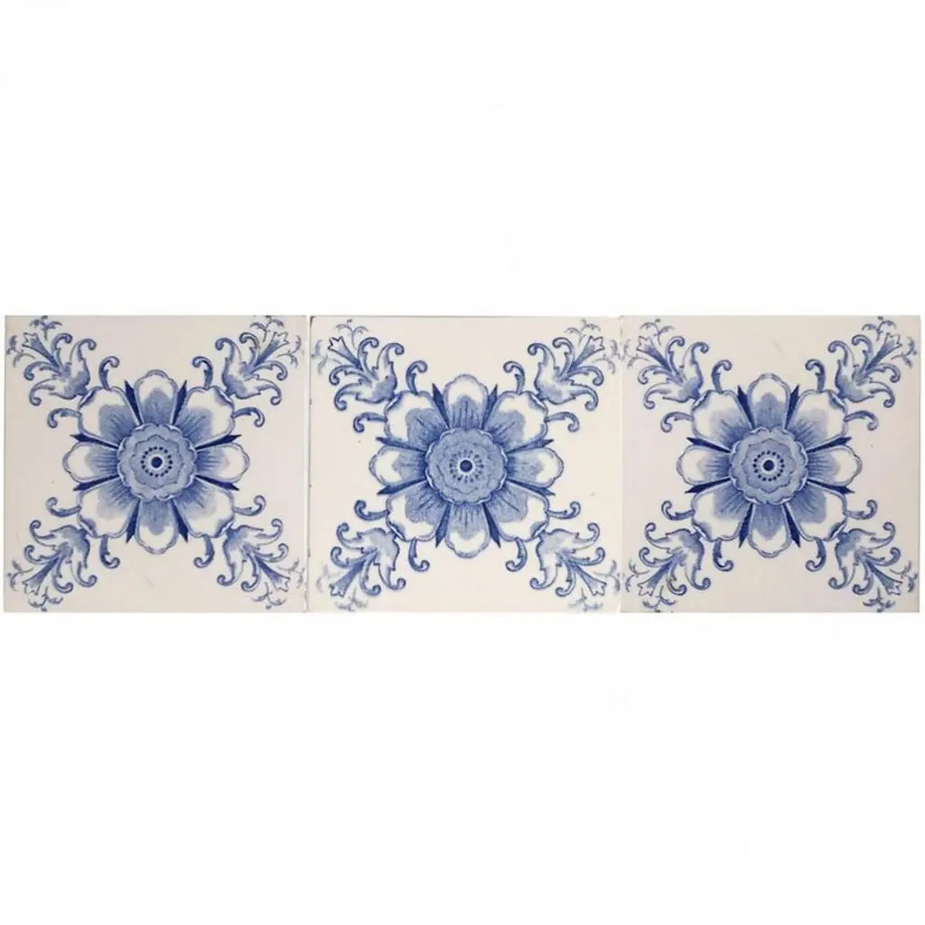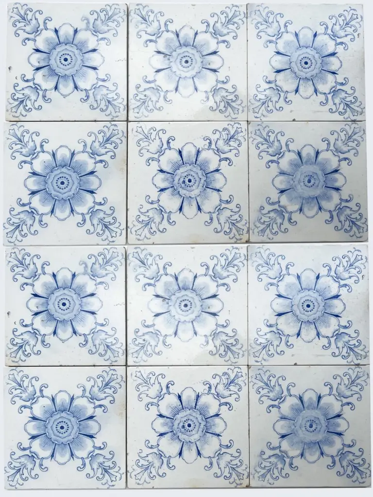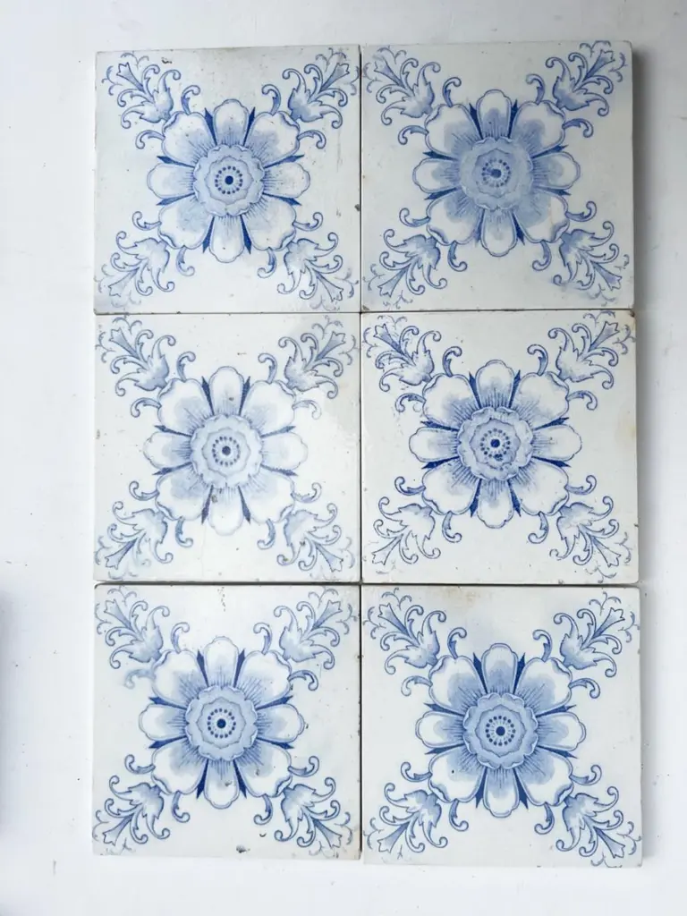 Handmade tiles in white and blue glazed color. With an illustration of a large flower and some leaves. Manufactured around 1920 by Le Glaive, Belgium.These tiles would be charming displayed on easels, framed or incorporated into a custom tile design.The dimensions per tile are 4,7 inch (12 cm) × 4,7 inch (12 cm).Please note that the piece is for one piece! We have 130 tiles available.Condition is generally very good. Minor chips, scuffs, color different and wear associated with age. Some crazing to the glaze is part of the historical design.There can be slight variations in each tile's size because of their age and craftsmanship.