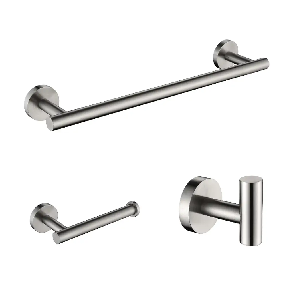 Enhance your bathroom with this 3-piece stainless steel hardware set, including a towel bar, toilet paper holder, and robe hook. Crafted from premium SUS304 stainless steel, this set is designed to resist rust, corrosion, and daily wear, ensuring long-lasting durability. The modern round design with hidden screws adds a stylish and sleek appearance to your bathroom decor. Easy to install with all necessary mounting hardware included.