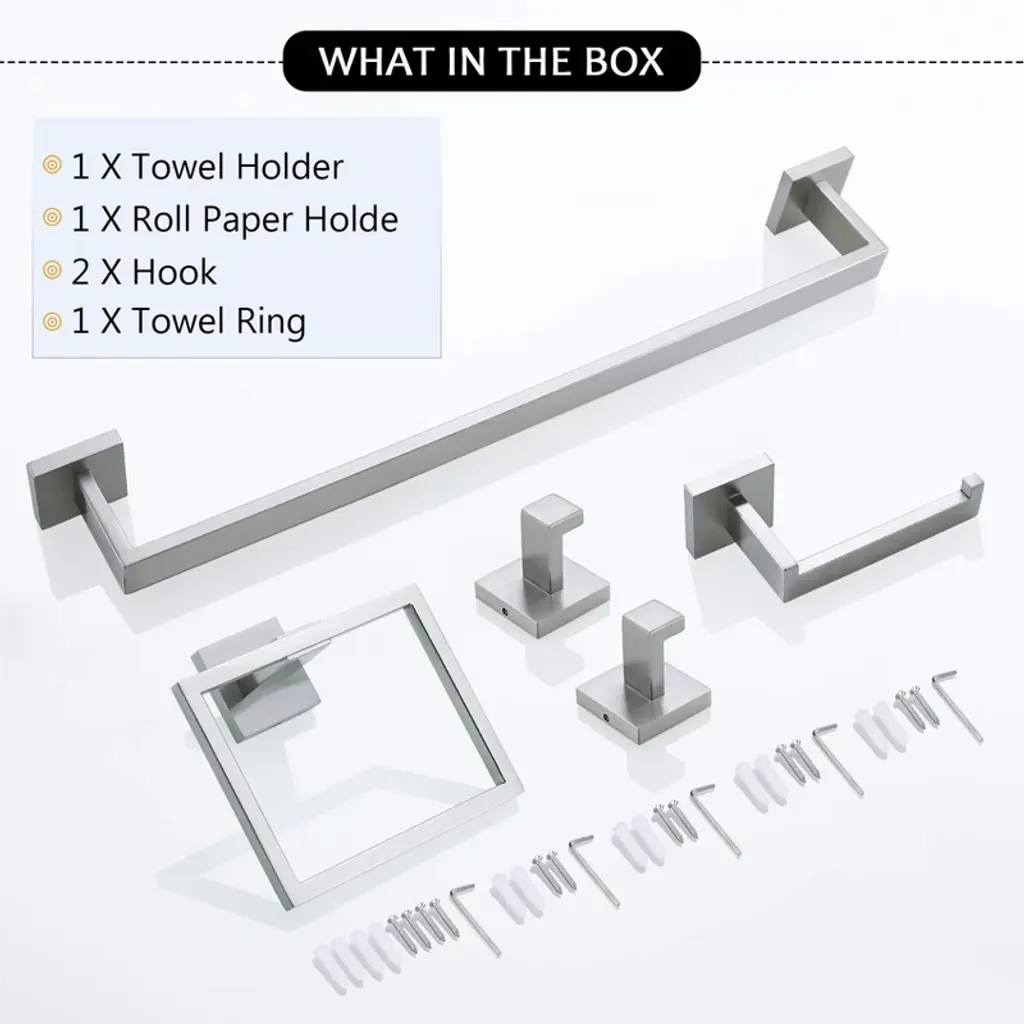 Detail: Mount Type: Drill and screw mount Total Number of Pieces Included: 5 Pieces Included: 5 Corrosion Resistant: Yes Stain Resistant: Yes Tarnish Resistant: Yes Rust Resistant: Yes Scratch Resistant: Yes Installation Required: Yes