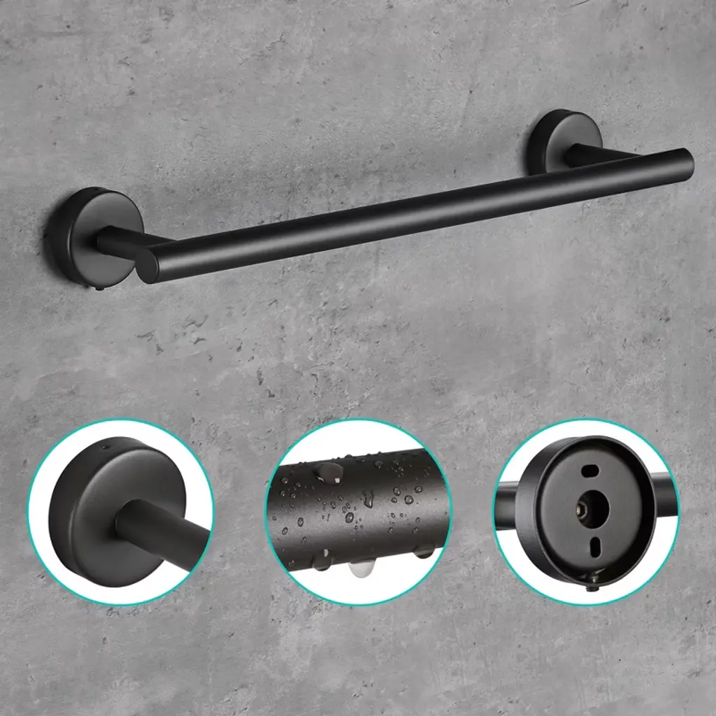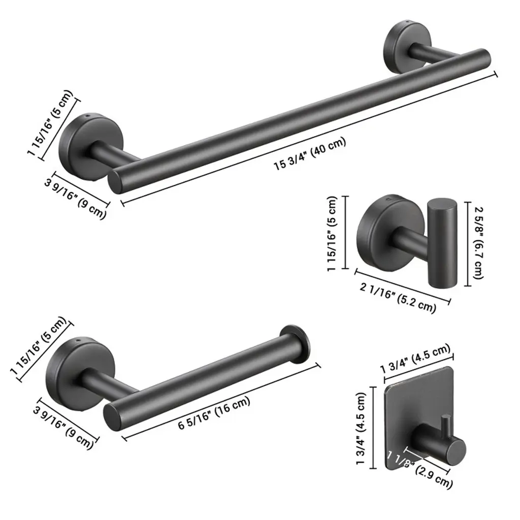 Features:- Practice & Versatile - 5-Piece Bathroom Hardware Set contains 1 pcs tower rack, 1 pcs toilet paper holder, 1 pcs towel hook, and 2 pcs adhesive hooks to make full use of your empty wall & keep bathing accessories well organized- 304 Stainless Steel - Made of heavy-duty 304 stainless steel, the hardware set provides excellent resistance to rust and corrosion, ensuring durability in a humid environment; Round shape without sharp edges avoids scratching your hands for safety- Industrial Style - The hardware set combines clean lines with dark grey plating to create a simple, uncluttered look in your home, incorporating industrial flairs into your home's existing decor while emphasizing the beauty of minimalism, a perfect decor idea for remodeling your bathroom- Easy to Install - Features concealed screw mount for simple DIY installation, drill holes on the wall, mount the base plate onto the wall with screws, and finally attach the main part to the base plate and tighten- Customer Service - All Aquaterior mounting hardware and accessories are included for easy installation, perfect for small bathrooms, laundry rooms, outdoor showers, hotels, and spas; If you have any problem with the bathroom hardware set, feel free to reach out to usSpecifications:- Towel Rack Dimension(LxWxH): 15 3/4" x 1 15/16" x 3 9/16" (40 x 5 x 9 cm)- Toilet Paper Holder Dimension(LxWxH): 6 5/16" x 1 15/16" x 3 9/16" (16 x 5 x 9 cm)- Towel Hook Dimension(LxWxH): 2 1/16" x 1 15/16" x 2 5/8" (5.2 x 5 x 6.7 cm)- Adhesive Hook Dimension(LxWxH): 1 3/4" x 1 3/4" x 1 1/8" (4.5 x 4.5 x 2.9 cm)- Material: 304 Stainless Steel- Net Weight: 1.54 Lbs (0.7 kg)Package Contents:- 2x Adhesive Hooks- 1x Toilet Paper Holder- 1x Towel Hook- 1x Towel Rack- 8x Screws & Plastic Anchors- 4x Allen Keys- 1x Manual