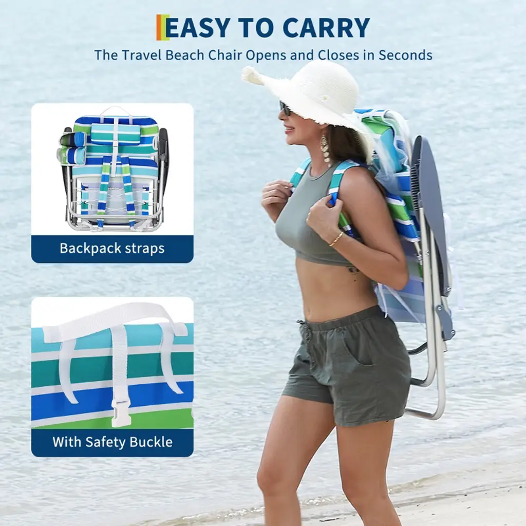 ADJUSTABLE RECLINING COMFORT: Customize your lounging angle with a 5-position recline—perfect for sunbathing, reading, or napping. Breathable mesh and padded headrest keep you cool on scorching beach daysHANDS-FREE PORTABILITY: Integrated backpack straps let you carry gear, towels, and drinks effortlessly. Fold and stash in 10 seconds—ideal for crowded boardwalks, hiking trails, or RV tripsSTORAGE HUB: The oversized storage pouch holds sunscreen, books, or snorkel gearSALTWATER-RESISTANT DURABILITY: Rust-proof aluminum frame (300 lb capacity) and UV-resistant Oxford fabric survive sandy beaches, poolside chlorine, or mountain campsitesCOMPACT & TRAVEL-READY: Weighs only 9 lbs—lighter than most beach umbrellas. Fits in car trunks, boats, or checked luggage for spontaneous beach chair backpack adventures