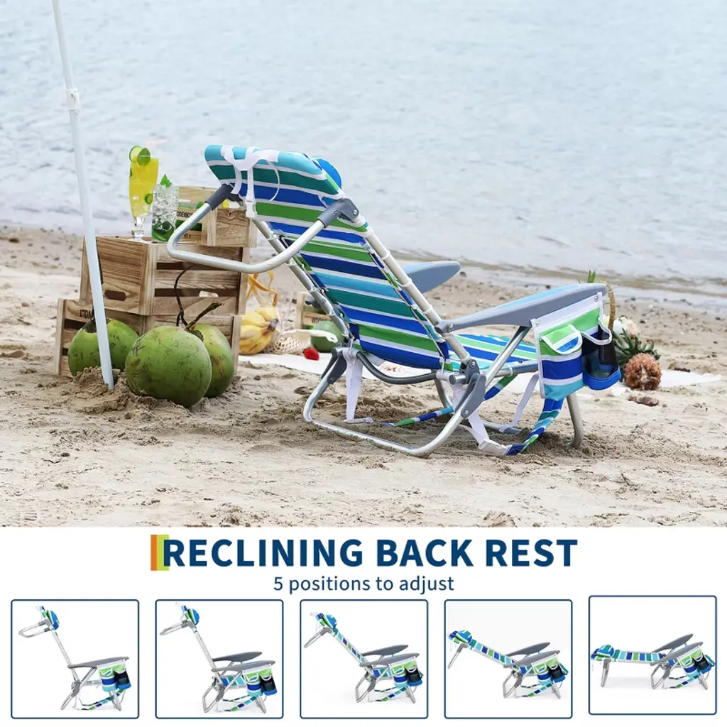 Backpack Beach Chair For Adults, Portable Lay Flat Folding Beach Chair With 5 Reclining Positions, Phone Pocket, Cup Holder & Towel Bar