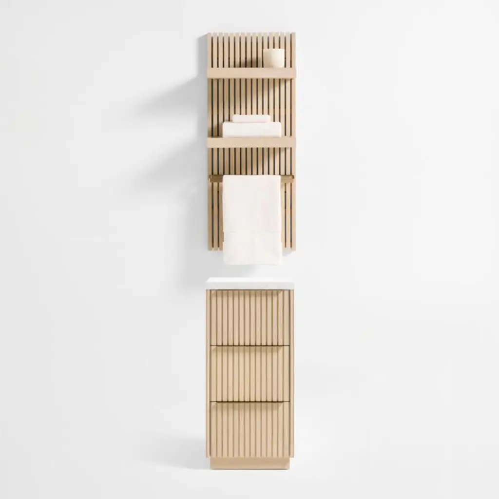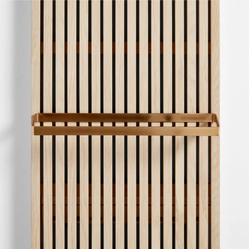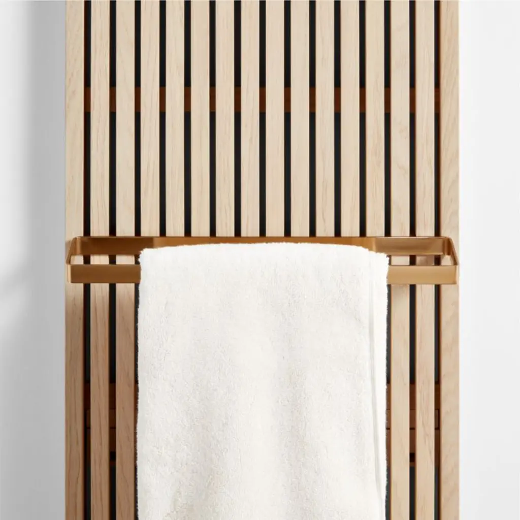 Free up space while elevating the look of your bath with our Batten storage collection. This brass-finished stainless steel towel rack easily hooks onto our Batten wall panel (sold separately) for convenient access and an organized display. Coordinating brass hooks and wood shelves (sold separately) provide extra options for custom storage.