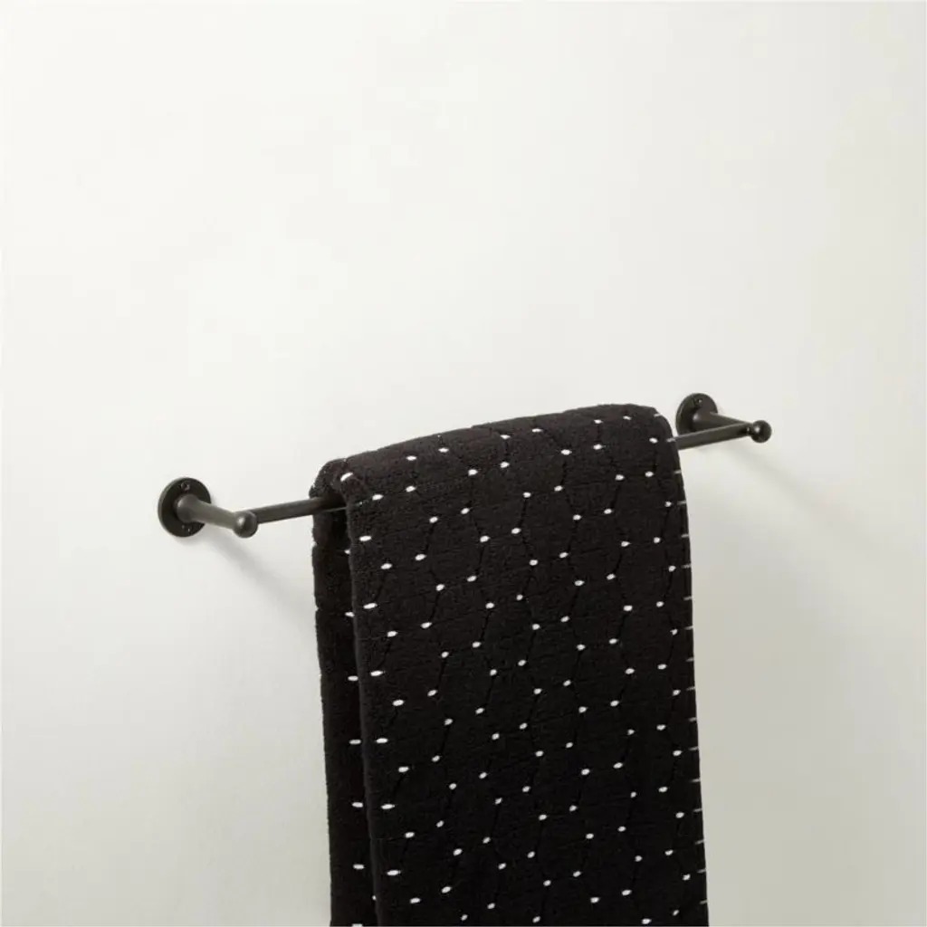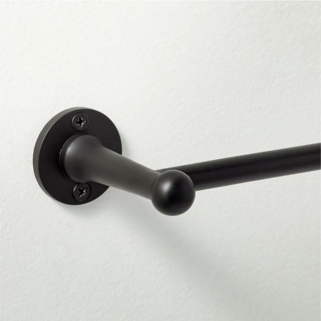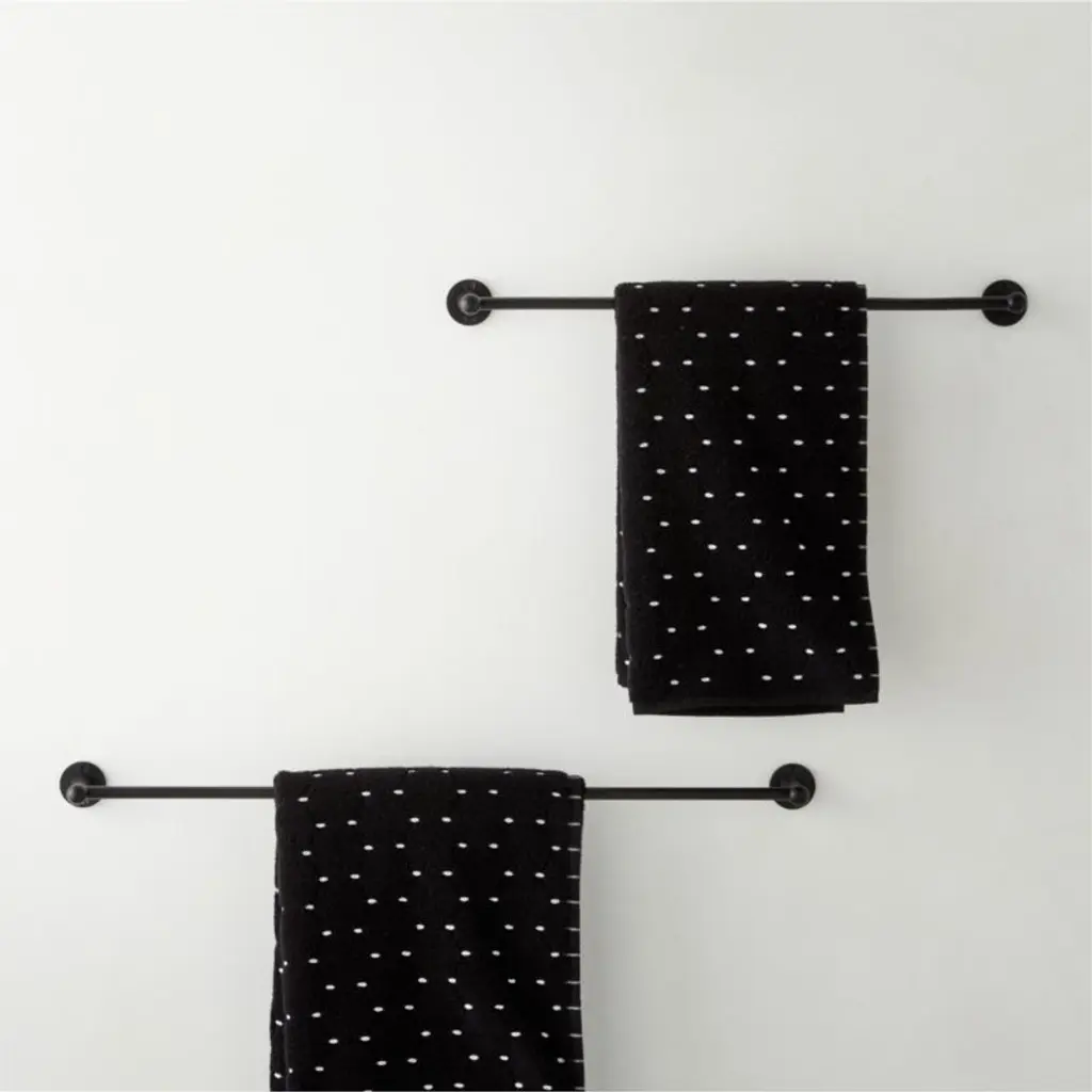 Designed by Chicago-based Sasha Adler, solid brass towel bar with boule details nods to classic French design. Sleek black finish gives it a contemporary edge. Collection also includes matching wall mount hook and toilet paper holder. CB2 exclusive.