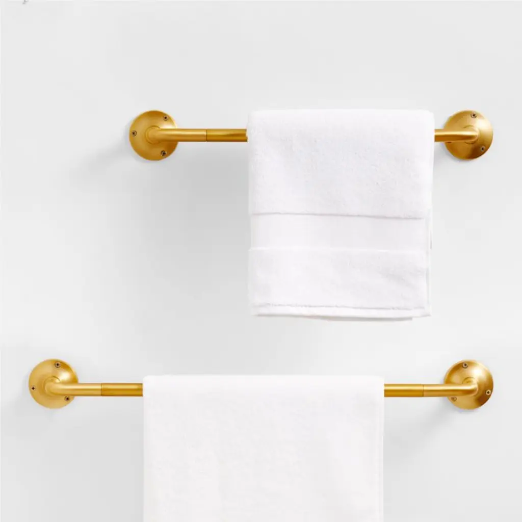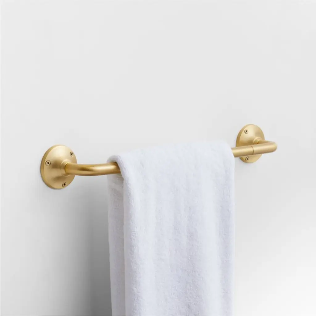 Sometimes it's the small things that pull a room together. That's why we've designed a hardware collection with modern silhouettes, clean lines and a touch of tradition to give your bathroom that perfect finishing touch. We named this 18-inch bath towel bar Classic for a reasona slender rod curves into round, tapered wall plates for a timeless look. Crafted of brass with a gleaming brushed finish, the bar has smooth edges and a slim profile. Hardware is included to make it easy to refresh the look of your powder room or bathroom.