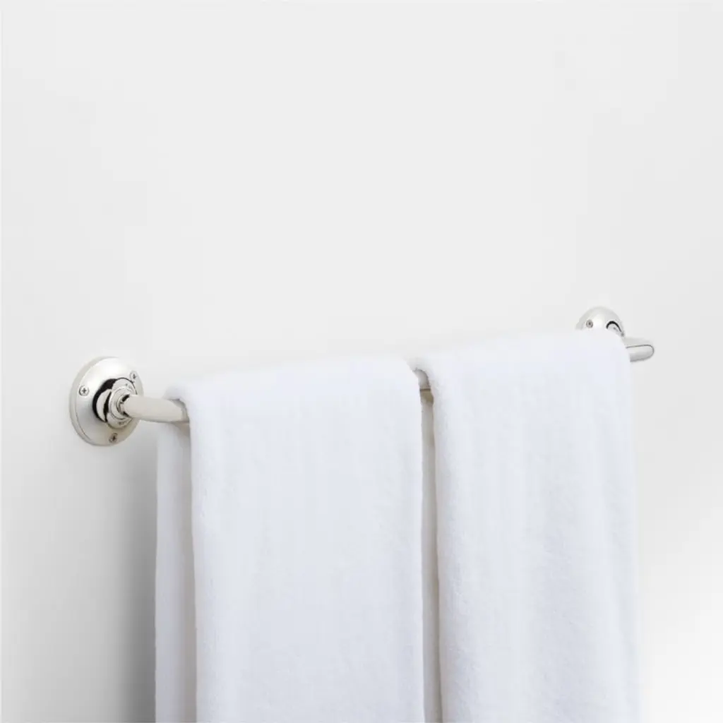 Sometimes it's the small things that pull a room together. That's why we've designed a hardware collection with modern silhouettes, clean lines and a touch of tradition to give your bathroom that perfect finishing touch. We named this 24-inch bath towel bar Classic for a reasona slender rod curves into round, tapered wall plates for a timeless look. Crafted of brass with a shiny chrome finish, the bar has smooth edges and a slim profile. Hardware is included to make it easy to refresh the look of your powder room or bathroom.