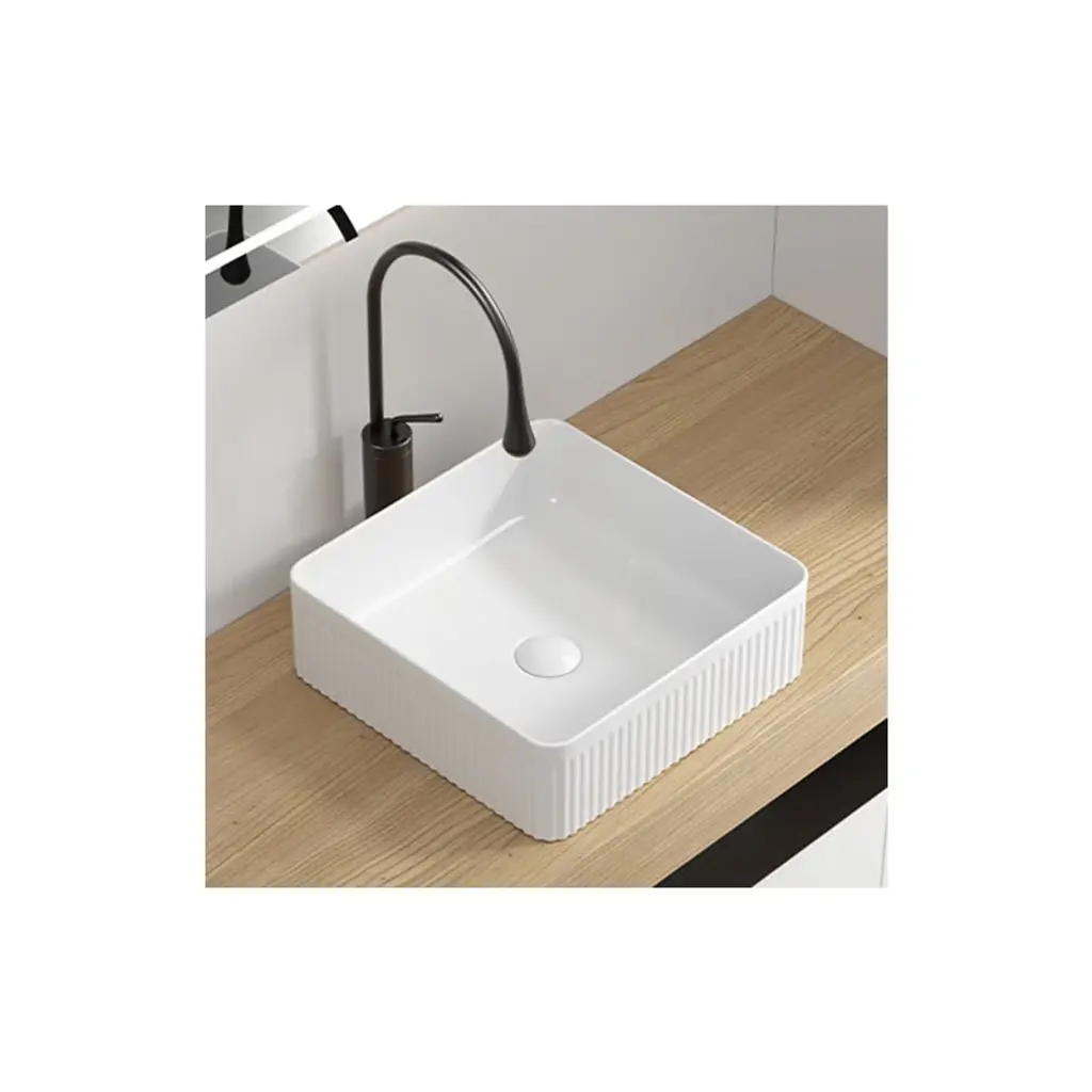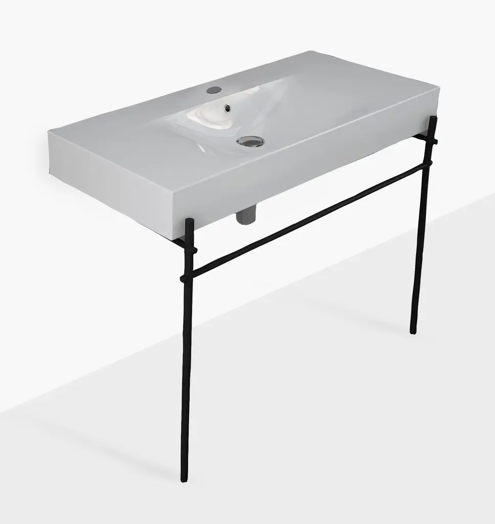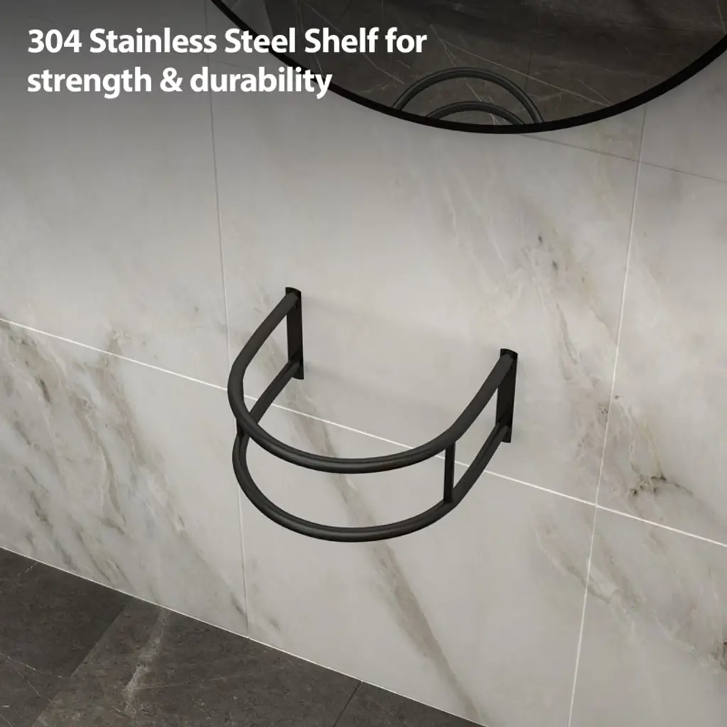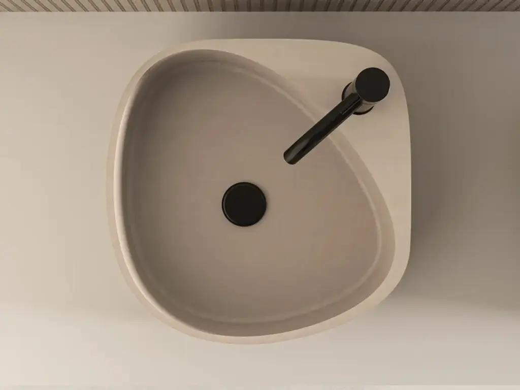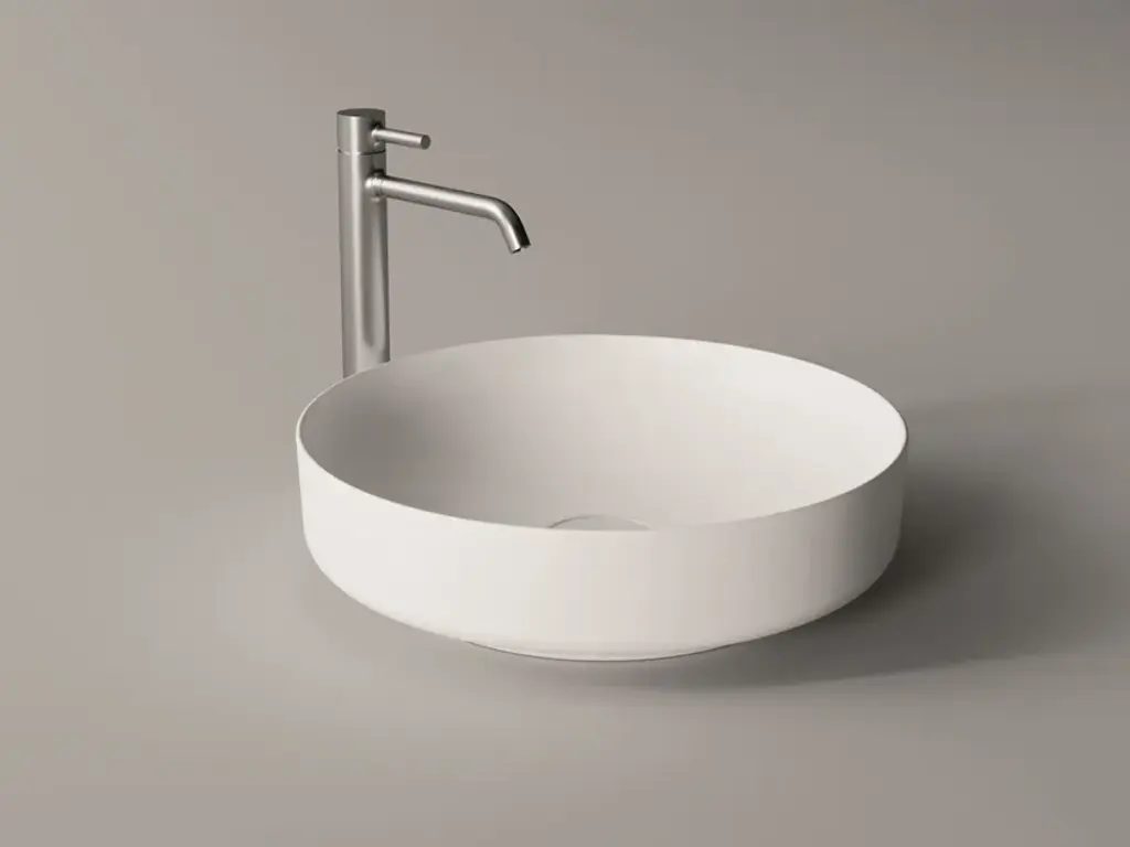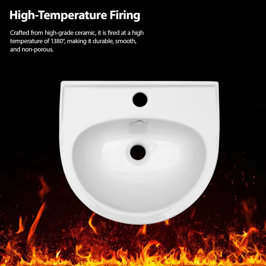 This semi-circular ceramic sink utilizes a floating installation system to maximize floor space, combining modern aesthetics with functional suspension engineering.