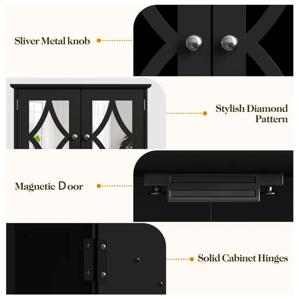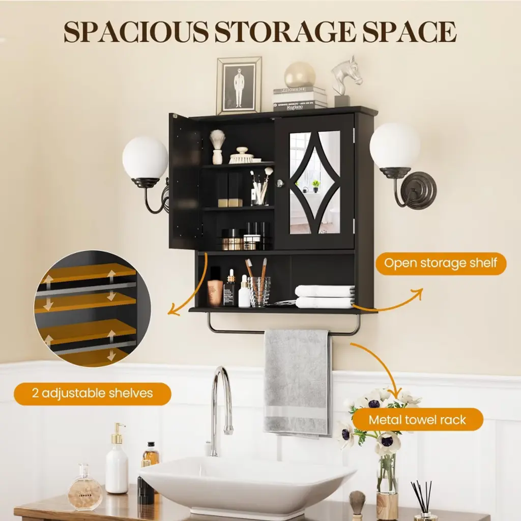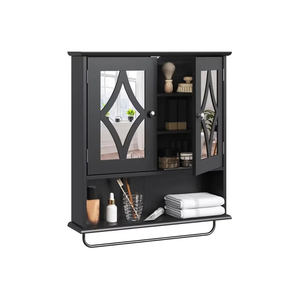 Transform your bathroom into a sanctuary of style and organization with ouVersatile medicine cabinet with mirror. Equipped with two adjustable shelves, this bathroom cabinet offers ample storage space for placing daily-used items. The open towel rack adds a touch of convenience, keeping your bathroom organized. Made of MDF material with water-resistant painting, the wall cabinet is sturdy and anti-rust, providing long-term service. With its retro-inspired design and diamond pattern accents, our vintage storage cabinet adds a touch of elegance to any room, whether it's the living room, kitchen, or bedroom. 1.SPACIOUS STORAGE SPACE: Open storage shelf/Metal towel rack/2 adjustable shelves 2.Sliver Metal knob, Magnetic Door, Stylish Diamond Pattern, Solid Cabinet Hinges 3 ADJUSTABLE SHELF HEIGHTS 4.ROBUST MATERIALS Water-resistant paint- Provide protection against moisture and humidity P2 grade MDF - Ensure long-lasting strength and durability 5.7lbs Rack load-bearing Specification Product Name: Medicine Cabinet Color: Black Material: MDF Overall Dimensions: 22''L × 5.1''W × 25.6''H