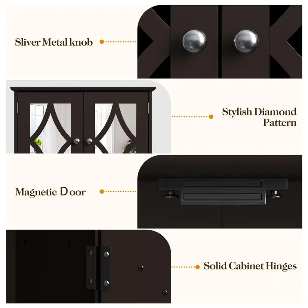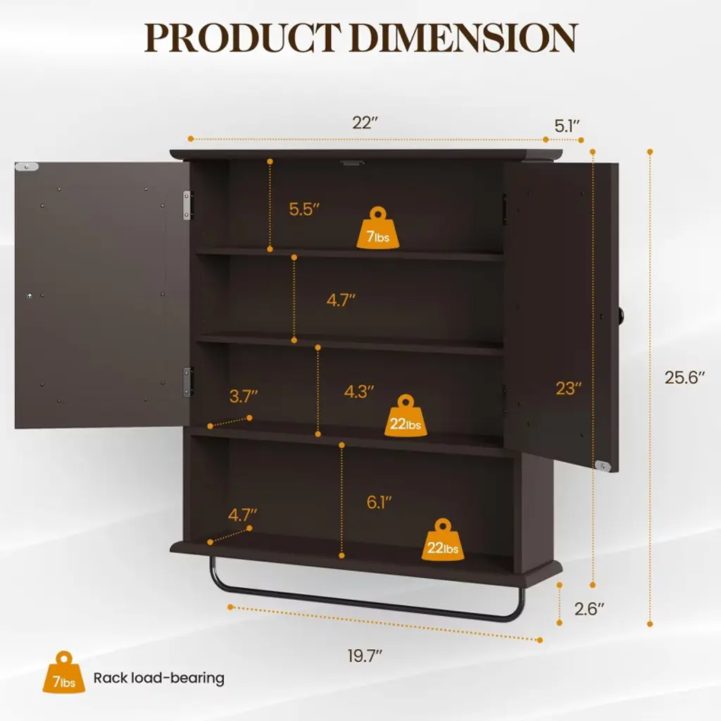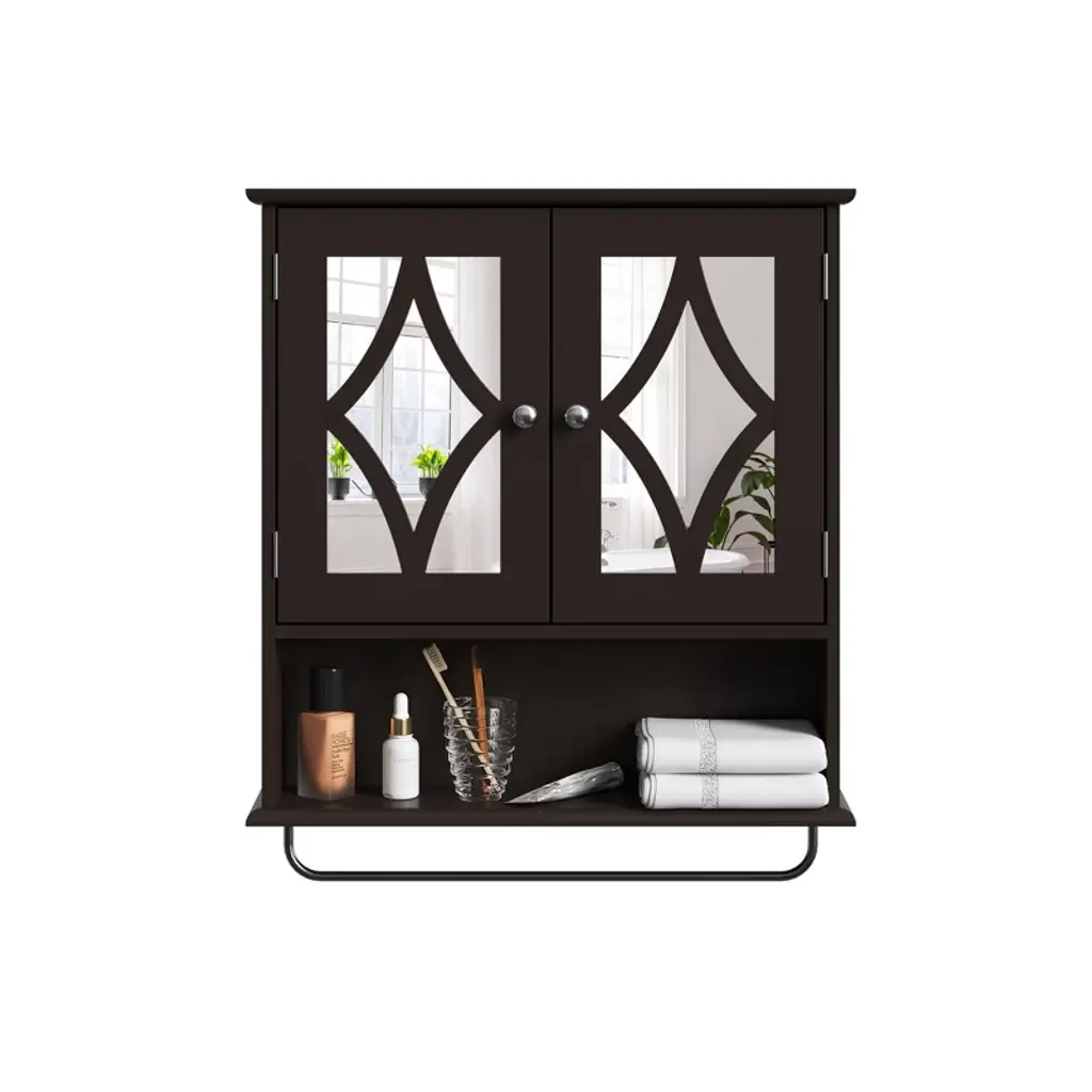 Transform your bathroom into a sanctuary of style and organization with ouVersatile medicine cabinet with mirror. Equipped with two adjustable shelves, this bathroom cabinet offers ample storage space for placing daily-used items. The open towel rack adds a touch of convenience, keeping your bathroom organized. Made of MDF material with water-resistant painting, the wall cabinet is sturdy and anti-rust, providing long-term service. With its retro-inspired design and diamond pattern accents, our vintage storage cabinet adds a touch of elegance to any room, whether it's the living room, kitchen, or bedroom. 1.SPACIOUS STORAGE SPACE: Open storage shelf/Metal towel rack/2 adjustable shelves 2.Sliver Metal knob, Magnetic Door, Stylish Diamond Pattern, Solid Cabinet Hinges 3 ADJUSTABLE SHELF HEIGHTS 4.ROBUST MATERIALS Water-resistant paint- Provide protection against moisture and humidity P2 grade MDF - Ensure long-lasting strength and durability 5.7lbs Rack load-bearing Specification Product Name: Medicine Cabinet Color: Black Material: MDF Overall Dimensions: 22''L × 5.1''W × 25.6''H