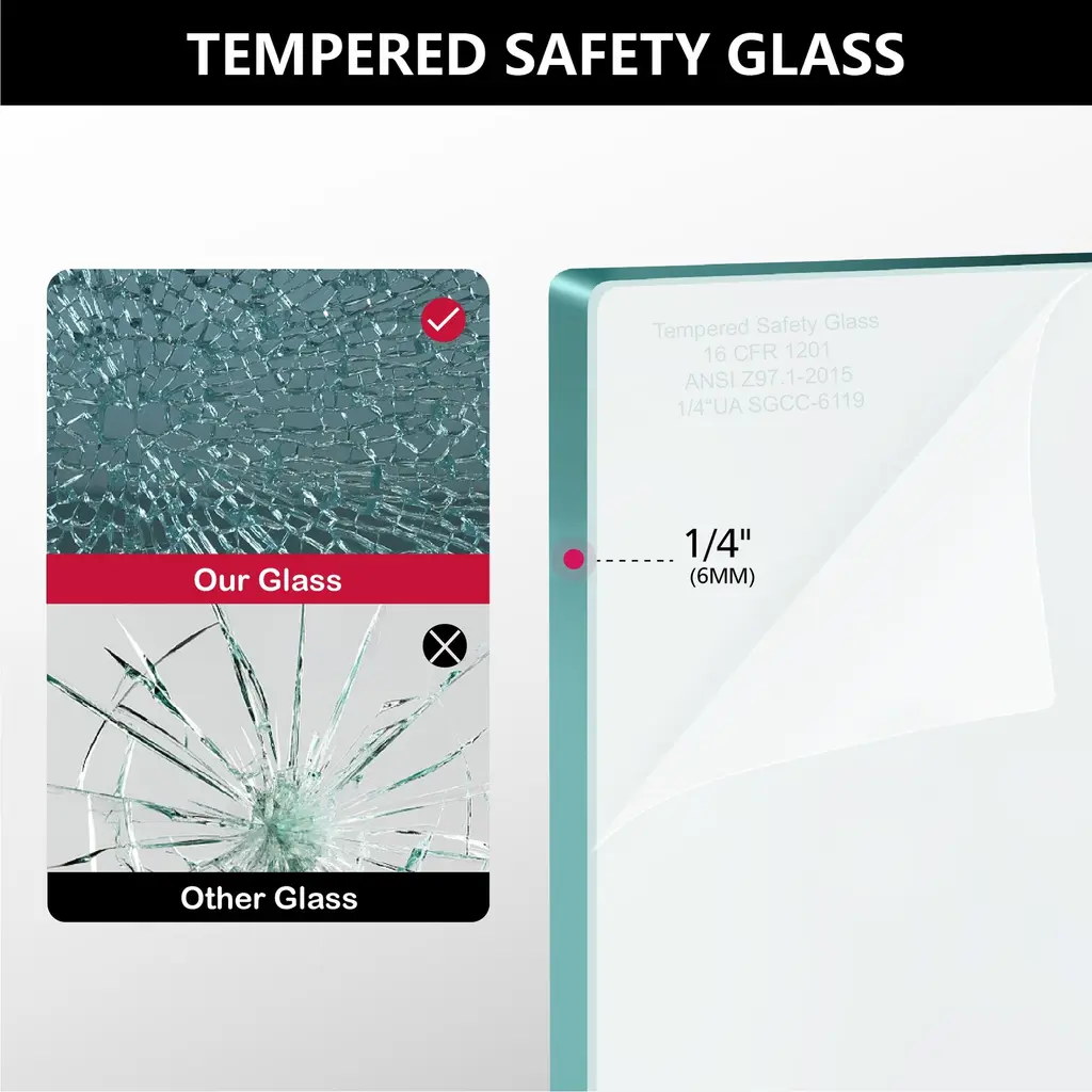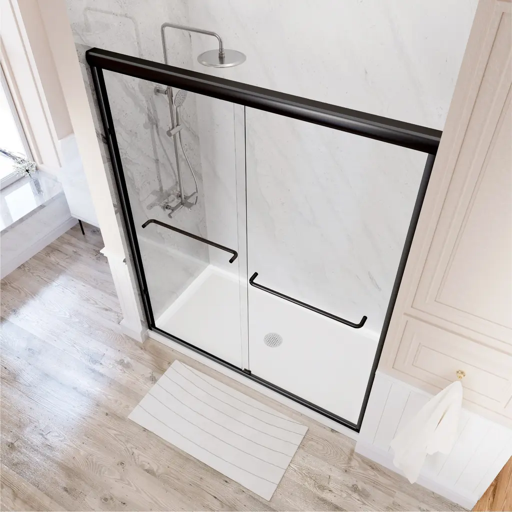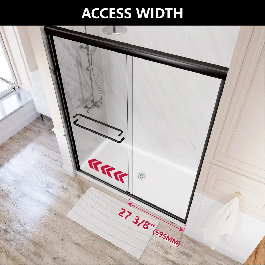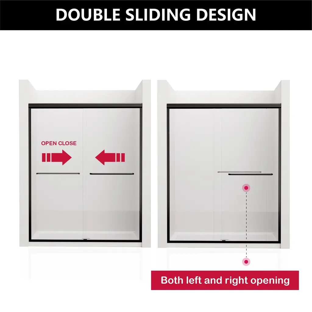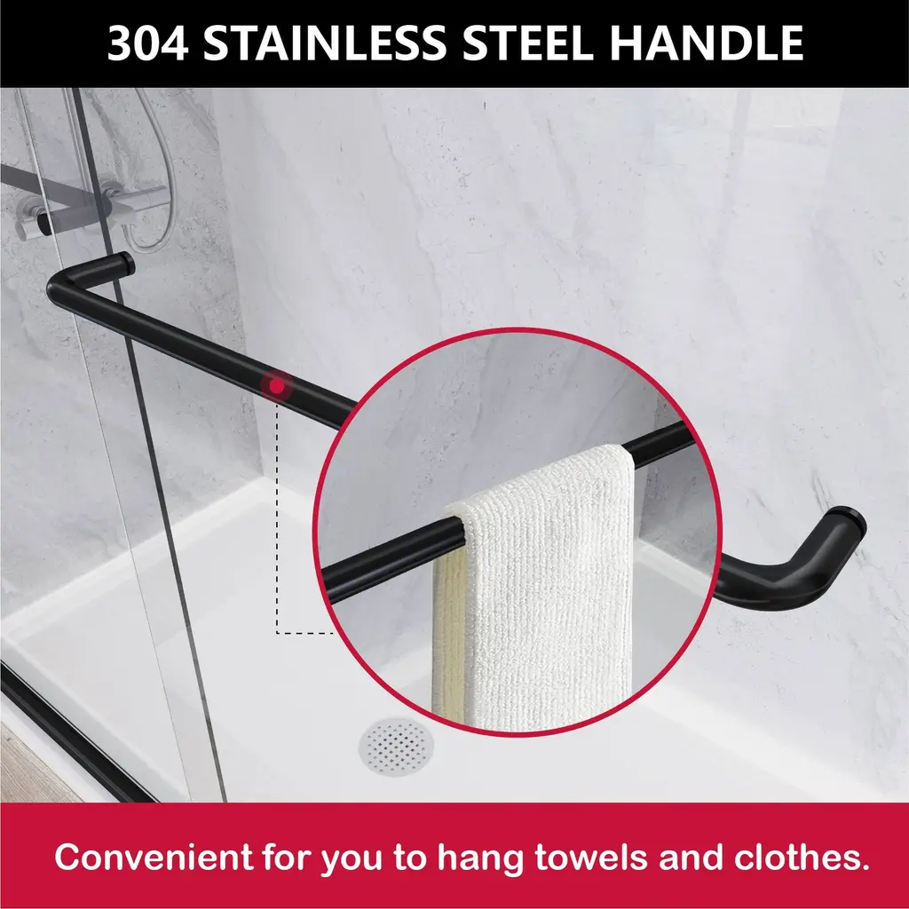 Introducing our stunning semi-frameless double sliding shower door, designed to elevate your bathroom with a modern artistic flair. Measuring 59" W × 72" H, crafted from 1/4-inch tempered glass, it has passed the ANSI Z97.1 and SGCC certification tests, ensuring safety and reliability. The durable, corrosion-resistant 304 stainless steel towel bar adds extra storage, while the versatile installation allows the door to open to the right or left, catering to your preferences.With a protective coating on the tempered glass surface, it minimizes water, soap scum, and dirt buildup, reducing your cleaning time significantly. Transform your bathroom with our unique shower door—it's the perfect choice for a stylish upgrade! Experience the ultimate shower today.Features