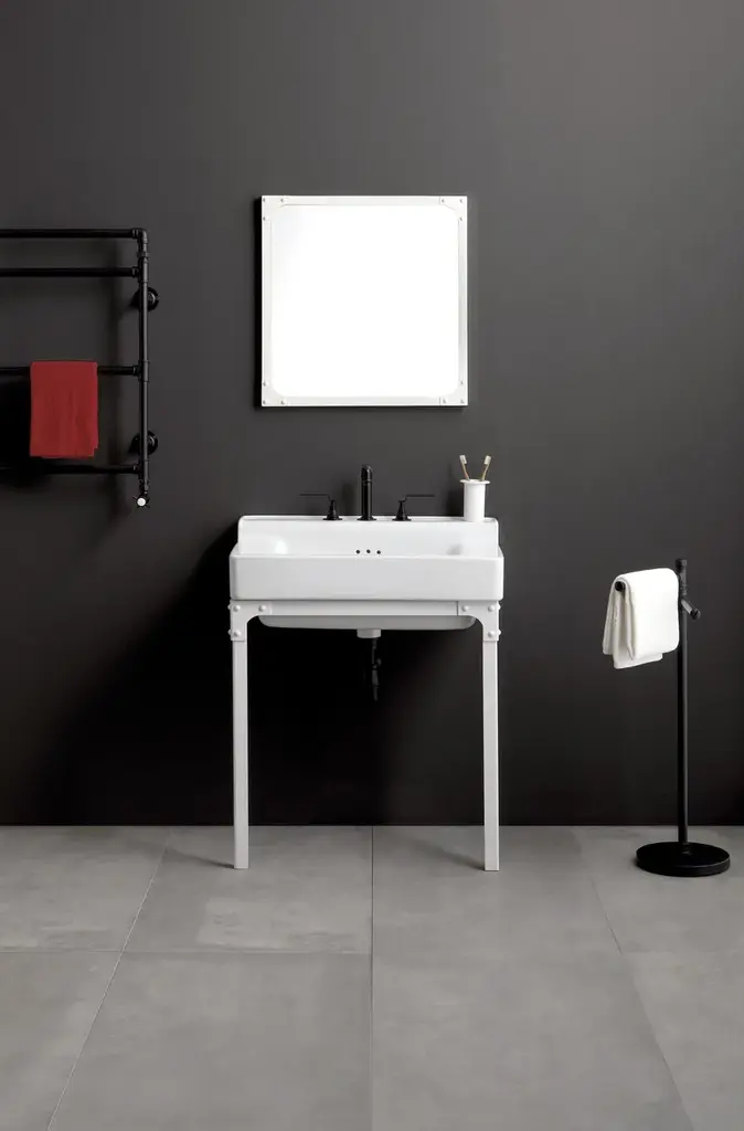 2 rails towel holder pedestal.Collection of washbasins and sanitary ware in a pure industrial style. Many choices of sinks (countertop or on a metal stand with a reel eiffel tower look). The Industrialis series exists with many different faucets and with several mirrors and accessories all in industrial style. Many finishes available for metal parts as well as wooden and metal furniture for additional storage. Floor mounted toilets and bidets and wall hung wc also available.