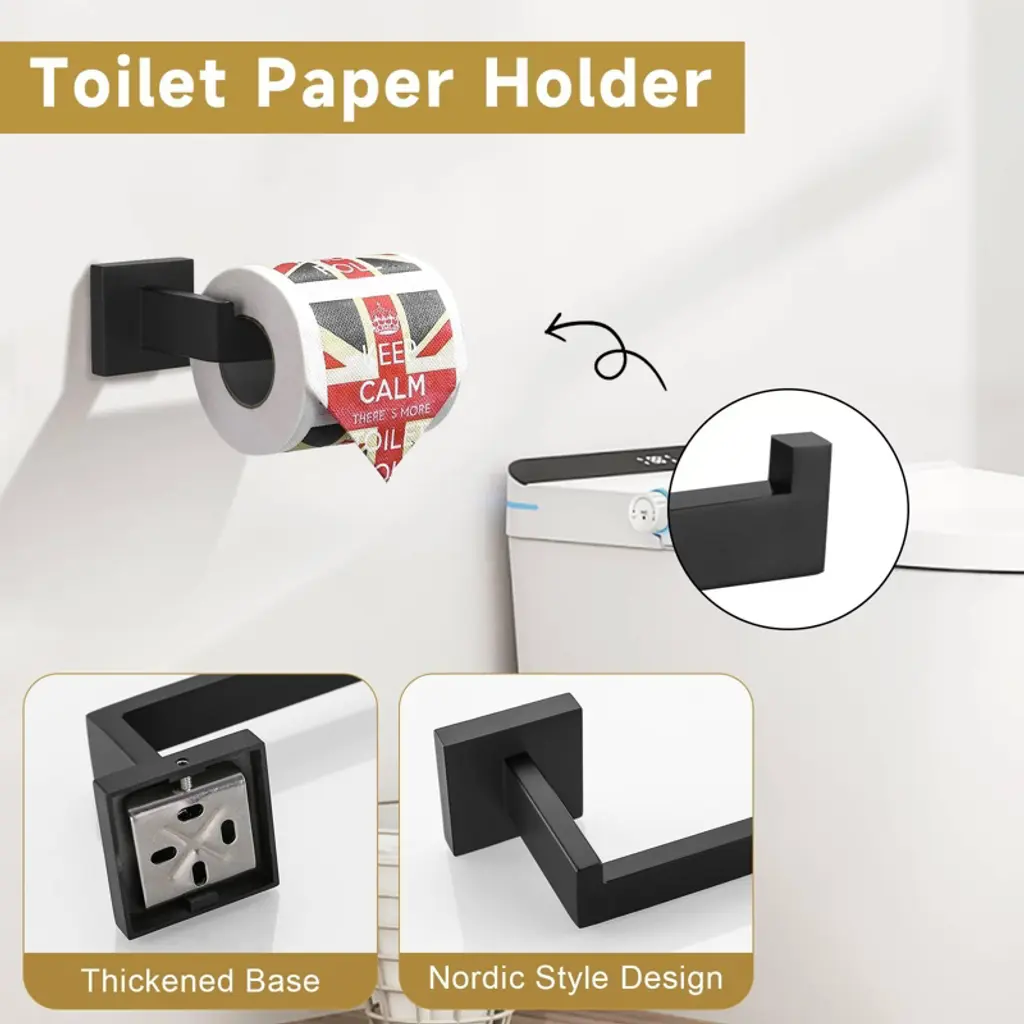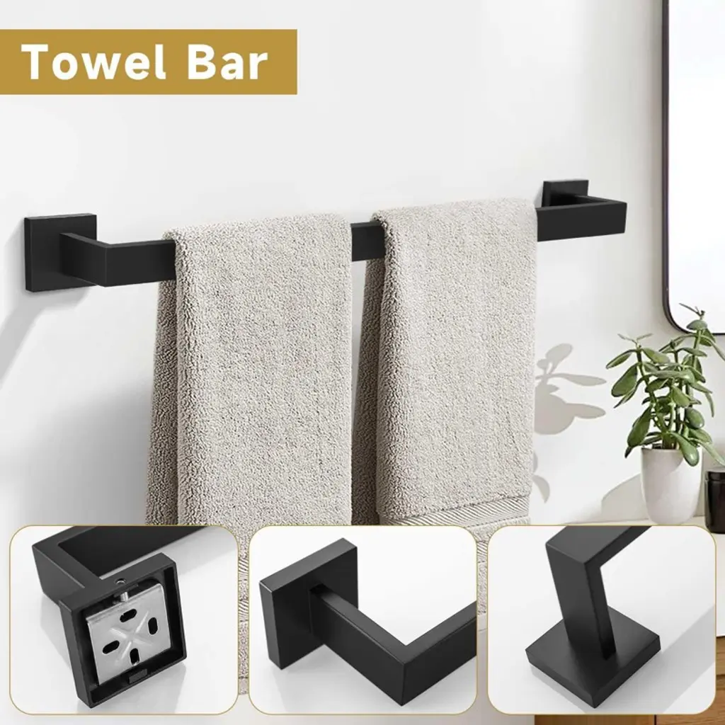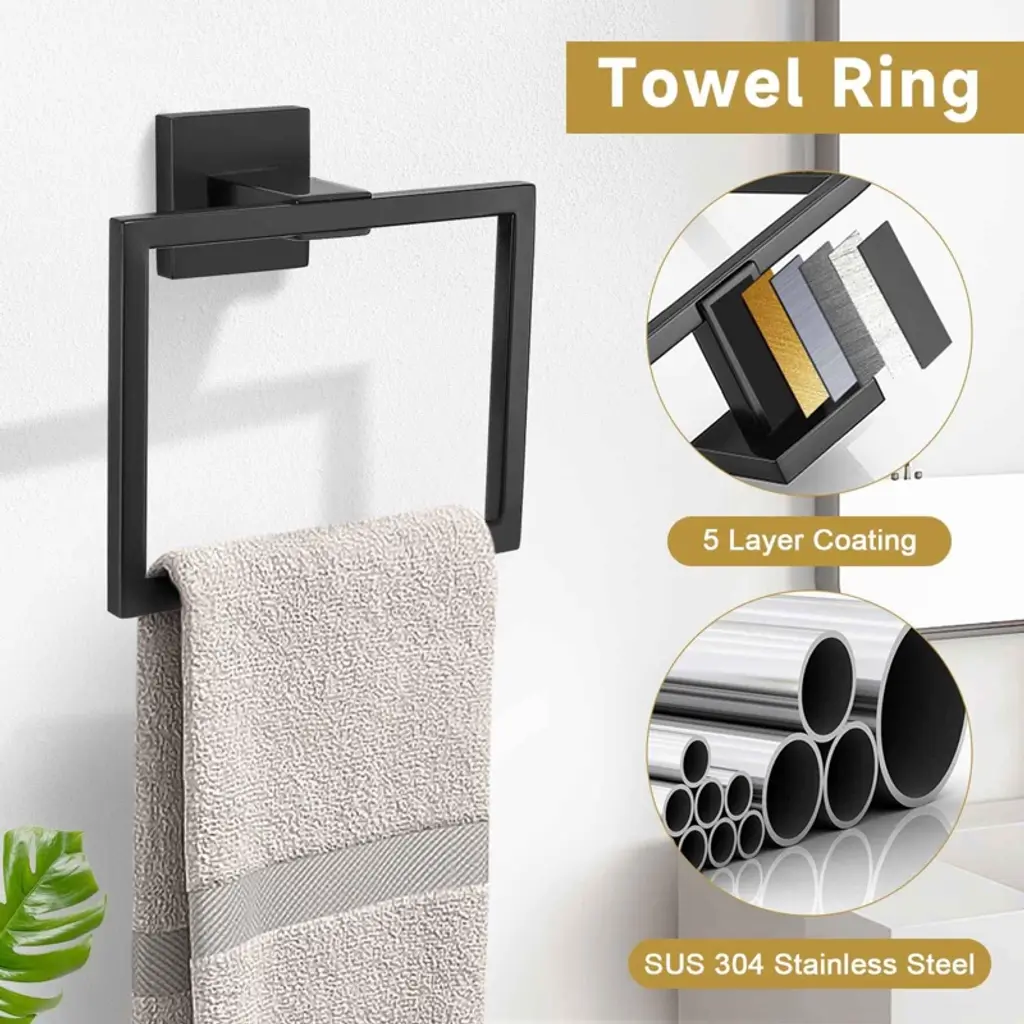 Upgrade your bathroom with this 5 - piece hardware accessories set. Made from SUS304 (18/8) stainless steel, it's highly resistant to rust and corrosion, ensuring long - term use. The black finish not only adds beauty but also resists spots and scratches, reducing maintenance. The set is designed with safety in mind, featuring chamfered edges and a modern squared shape. It includes a towel bar, towel ring, toilet paper holder, and two towel hooks, meeting all your bathroom needs. Wall - mounted for easy installation, it's a cost - effective solution that saves you from the hassle of choosing individual items. Ideal for any bathroom, it brings both functionality and style to your daily life.