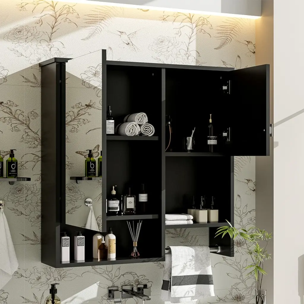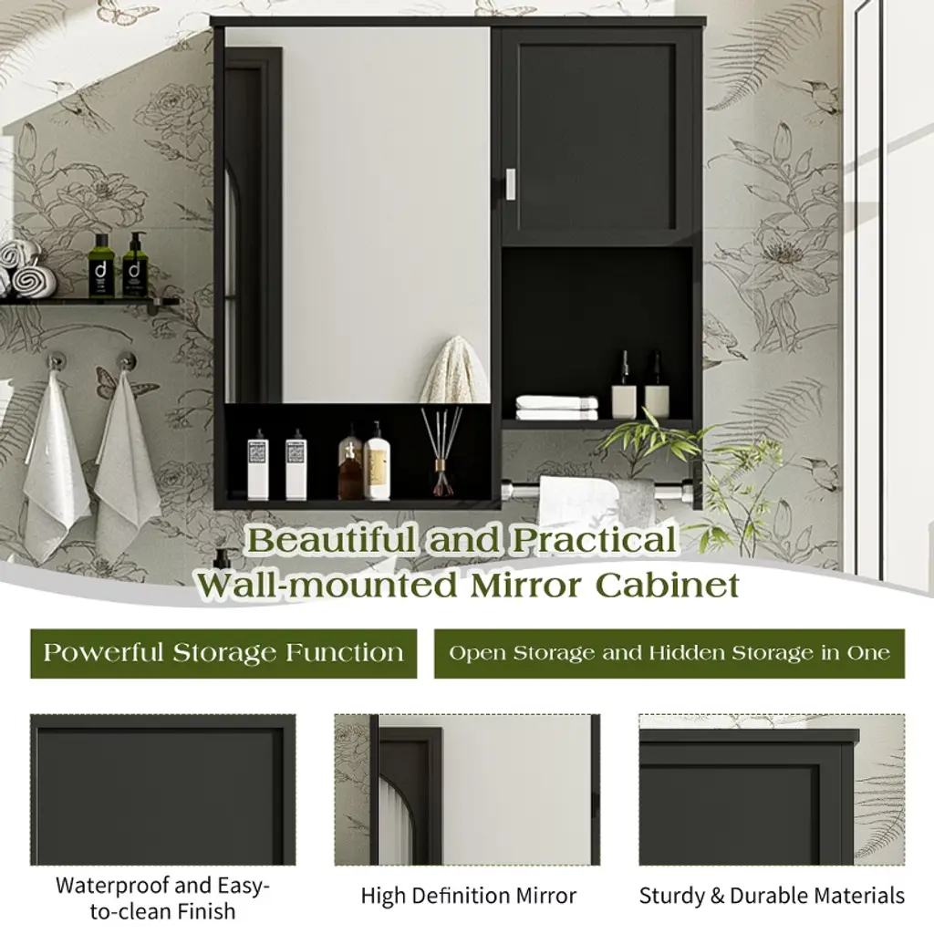 This modern wall-mounted bathroom medicine cabinet blends style with functionality. Crafted from high-quality, eco-friendly MDF, it features a high-definition mirror for clear reflections. The smart design incorporates both hidden and open shelves, offering ample storage while keeping your bathroom organized. Two built-in storage cabinets conceal clutter, while the three-layer adjustable shelf provides flexible space for various items. Additionally, the integrated towel bar adds extra convenience, allowing you to hang towels or clothes easily. Whether placed in the bathroom, bedroom, or other spaces, this cabinet offers a sleek, practical storage solution that enhances the overall aesthetic of your home.
