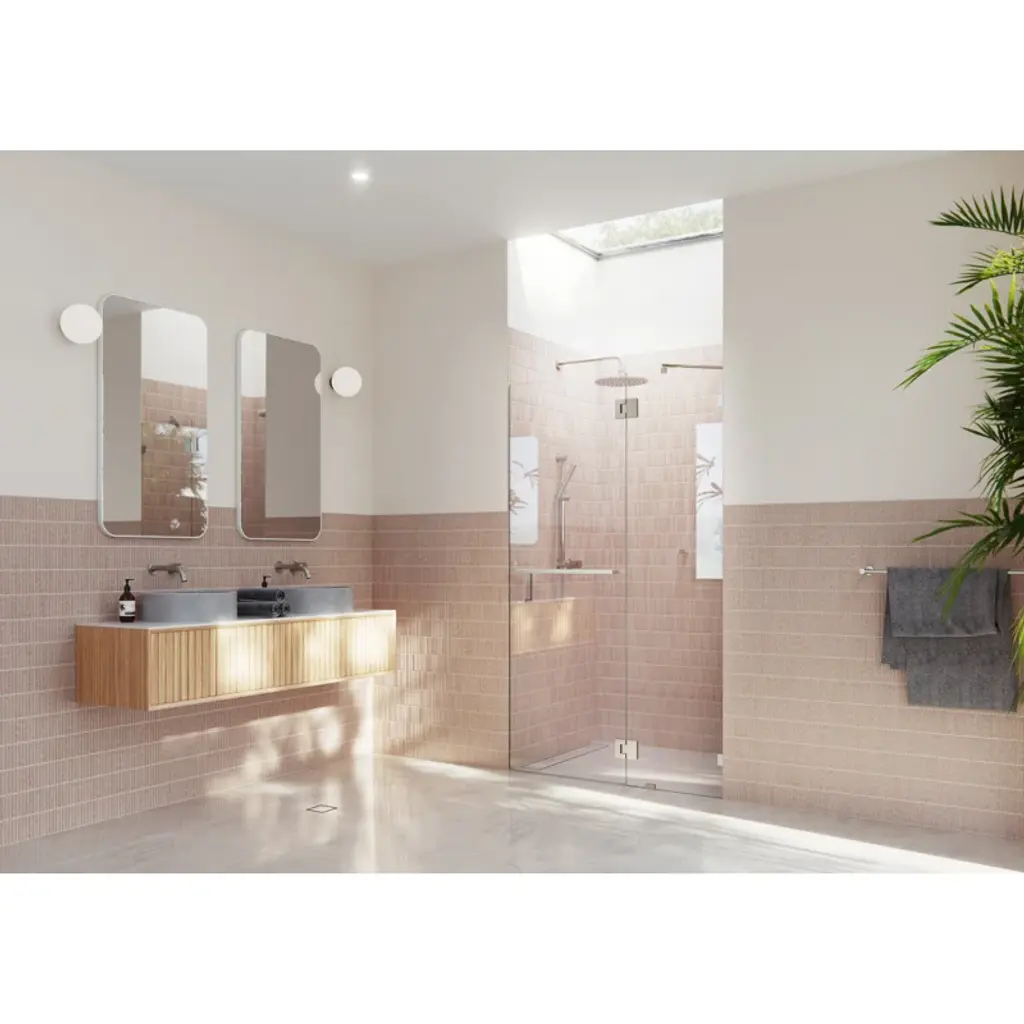 The Mimas, our range of glass-hinged shower doors and enclosures, has a luxurious, modern feel that adds light and space to any bathroom. Taller than most competitor shower enclosures, our frameless 3/8” tempered glass panels come in a standard 78” height. Glass is treated on both sides with EnduroShield coating, which aids in repelling water and soap residue, allowing the panels to be fully reversible. In addition, our superior quality solid brass hardware is available in a variety of color finishes to suit any bathroom. With our extensive range of frameless shower door and panel sizes, the Mimas by Glass Warehouse is inspired by the design philosophy of form follows function, featuring a stylish towel bar on the shower door. Moreover, because the door is glass-hinged, you can access the enclosure from the wall side rather than the middle, making it easy to reach your tapware.
