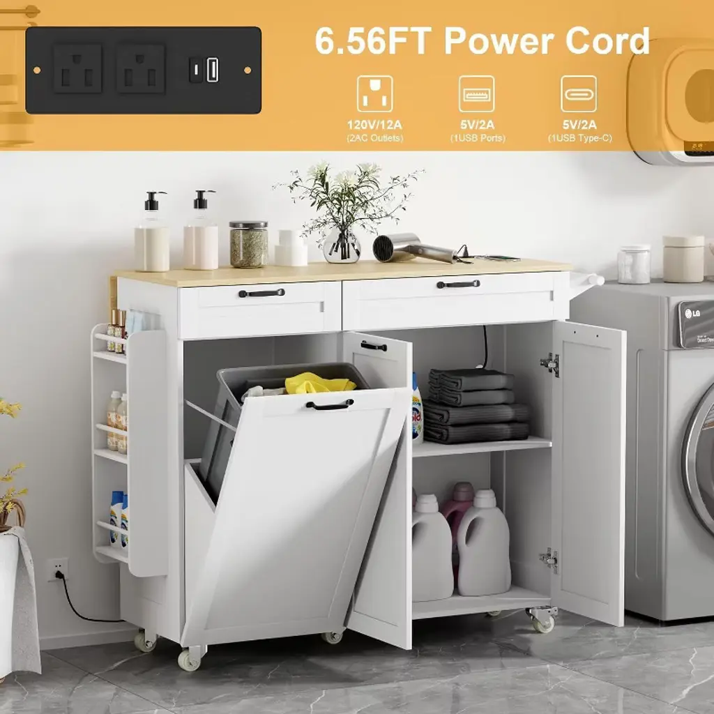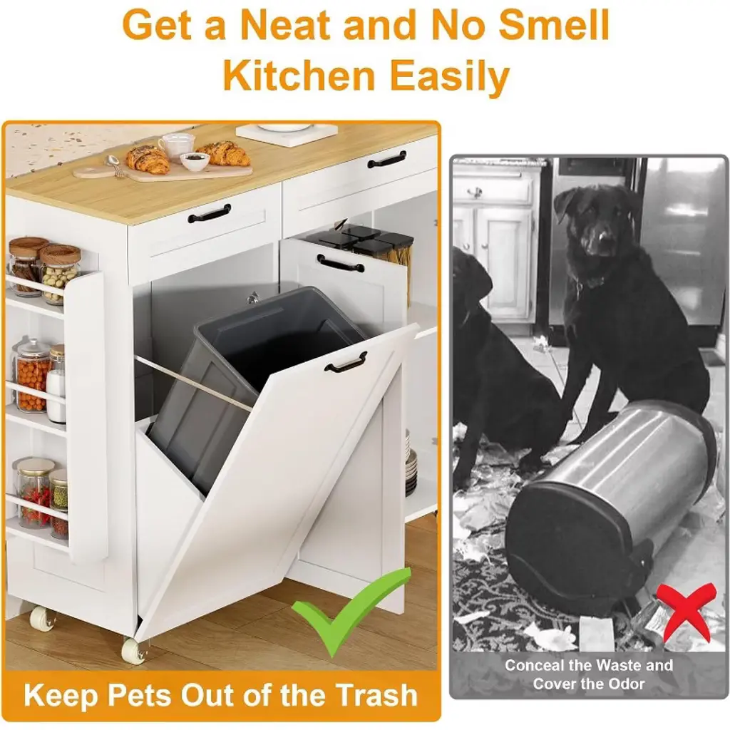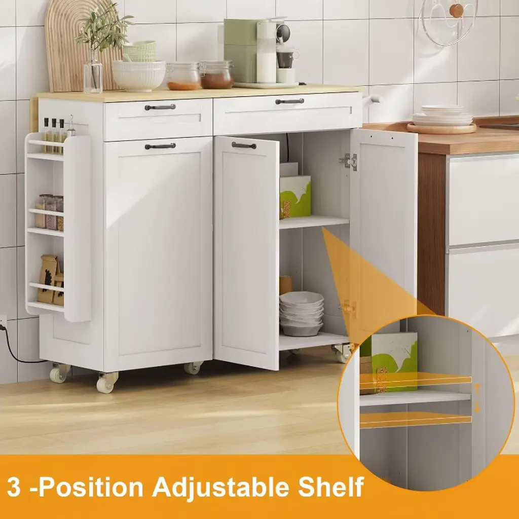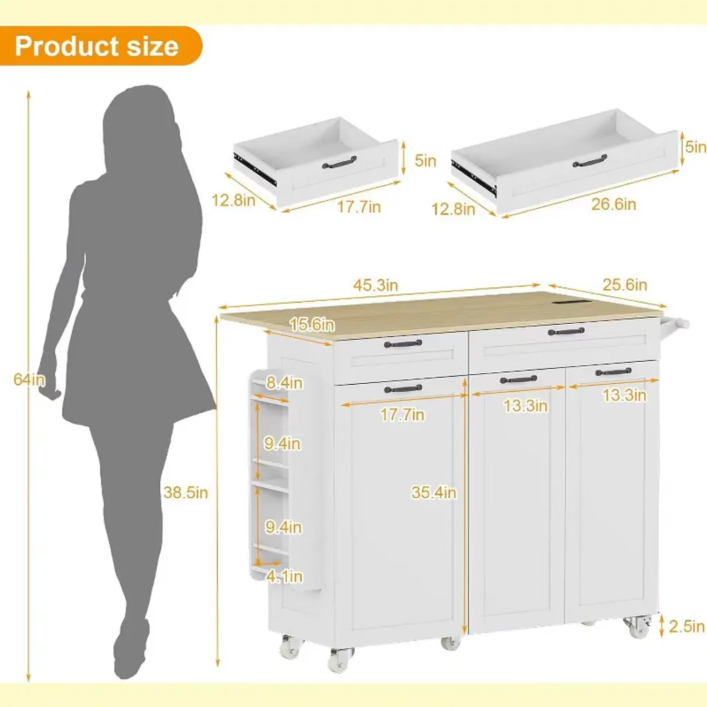 Mobile Rolling Kitchen Island with Power Outlet & Drop Leaf – Multi-Functional Cart with Trash Storage, Spice Rack, Towel Bar & Knife Holder.45.3" countertop offers generous space for food prep, while 2 large cabinets and 2 drawers keep utensils, cookware, spices, and appliances neatly organized.