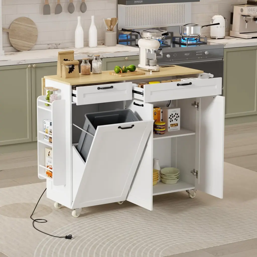 Mobile Rolling Kitchen Island – Multi-functional Cart With Trash Storage, Spice Rack, Towel Bar & Knife Holder