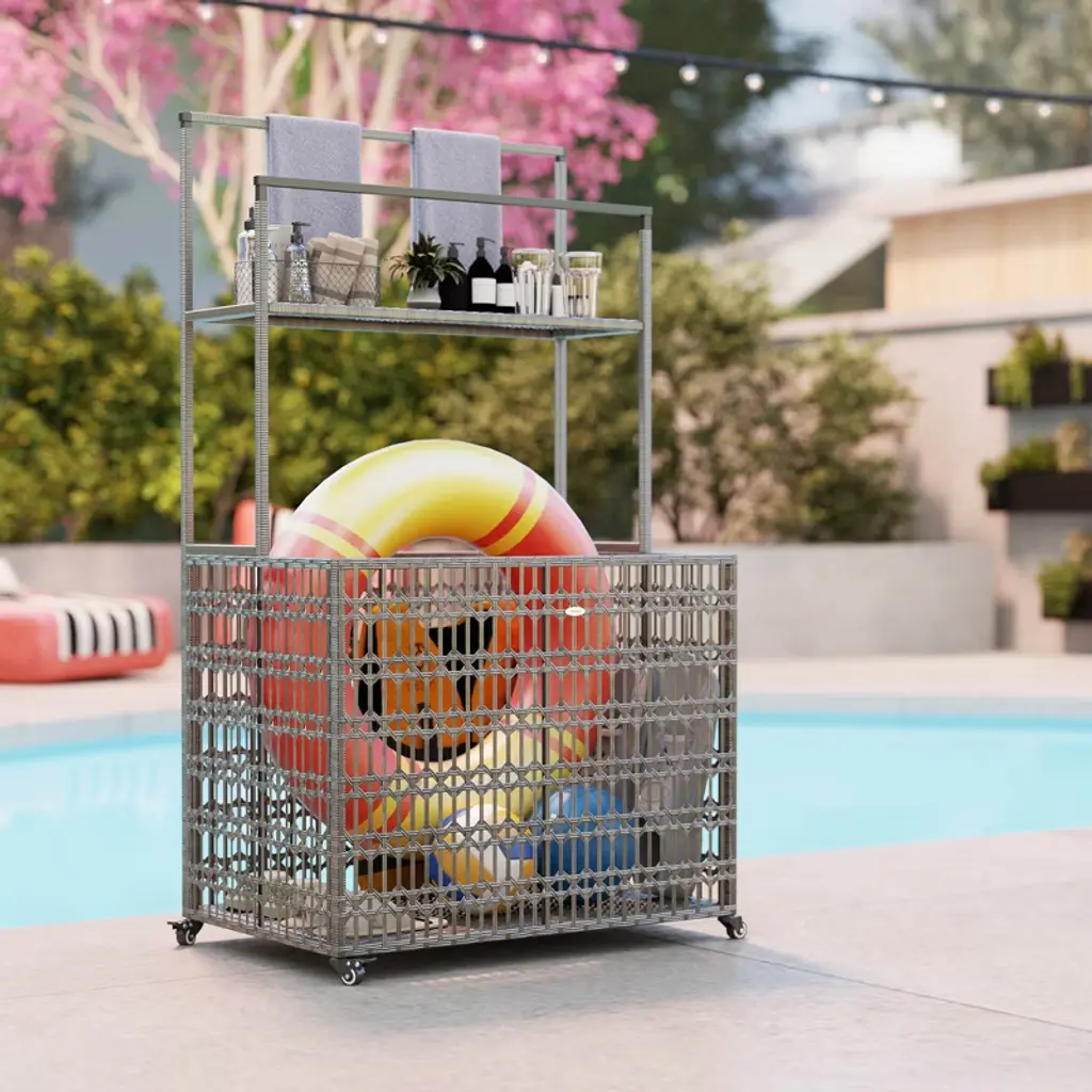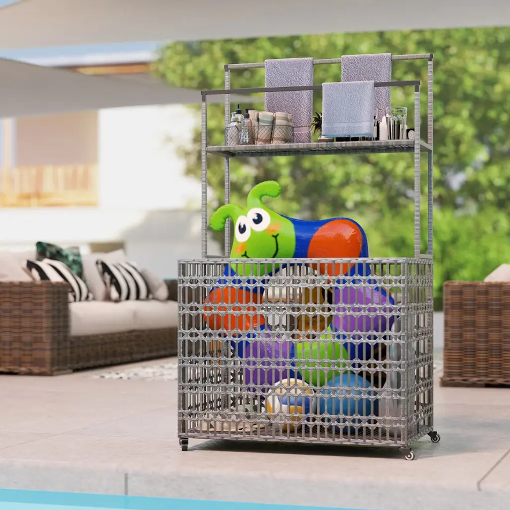 Dive into organization with the Outsunny wicker pool storage basket! Effortlessly cart and store all your pool essentials, from noodles to towels, with a spacious basket, handy shelf, and dual towel bars. This pool caddy is designed with powder-coated steel and weather-resistant PE rattan and equipped with smooth-rolling wheels, ensuring your poolside stays neat and stylish.