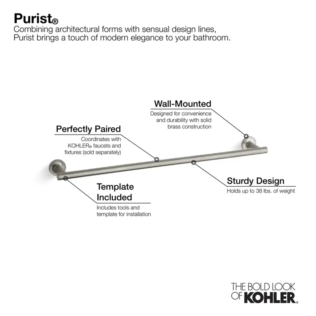 Purist accessories combine architectural forms with sensual design lines for a modern, minimalist look. Featuring a sturdy round bar mounted to the wall by circular plates, this towel bar brings the art of simplicity to your bath or powder room, blending in beautifully with the purist collection.