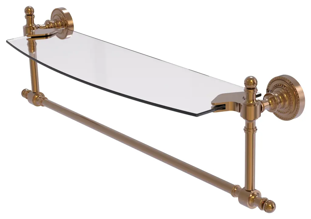 Add space and organization to your bathroom with this simple, contemporary style glass shelf. Featuring tempered, beveled-edged glass and solid brass hardware this shelf is crafted for durability, strength and style. Integrated towel bar provides space for your favorite decorative towels or for your everyday use. One of the many coordinating accessories in the Allied Brass Collection of products, this subtle glass shelf is the perfect complement to your bathroom decor.Brushed Bronze, a satin-like texture, metallic dark golden finishMade with 1/4" thick glass for safety and strengthCrafted from the Finest Solid Brass MaterialsClever Design adds the convenience of an integrated towel barGlass Dimension 18 Inches x 5 InchesConcealed screw mounting hardware installs easilyProvided with a Limited lifetime warranty