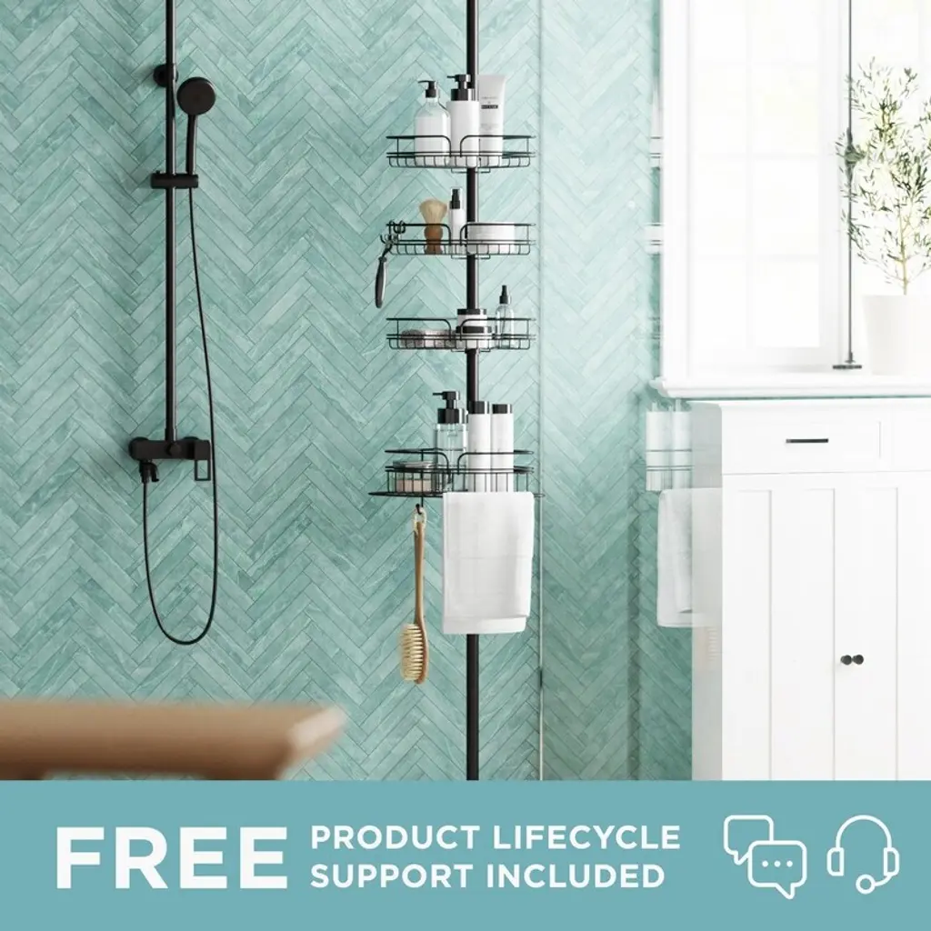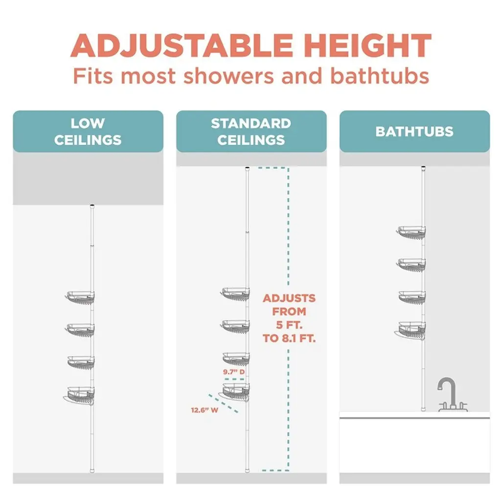 Sleek, Rust-Resistant Finish: The corner shower caddy features a stylish matte black finish that resists rust and corrosion, ensuring long-lasting durability and a sleek, polished, sophisticated modern look in your bathroom or shower.4 Adjustable Shower Shelves: This tension pole shower caddy offers four adjustable wire shelves, including one deep basket for taller bottles. Each shelf holds up to 7.5 lbs., providing ample shower storage and versatile organization space.Complete Shower Organization: Equipped with built-in hooks, razor holders, and a towel bar, this corner shower organizer helps keep your bathroom clutter-free, your essentials neatly organized, and always conveniently within easy reach.Quick-Drying Shelves: The open wire design allows water to drain efficiently, preventing buildup and helping your items dry faster, keeping your shower area clean and fresh with minimal upkeep and better airflow, making it an ideal shower organizer.Tool-Free Adjustable Installation: The tension rod shelf design easily adjusts from 60 to 97 inches in height, fitting most standard shower spaces. Enjoy a secure, wobble-free installation with no tools required and an easy setup for a perfect fit.