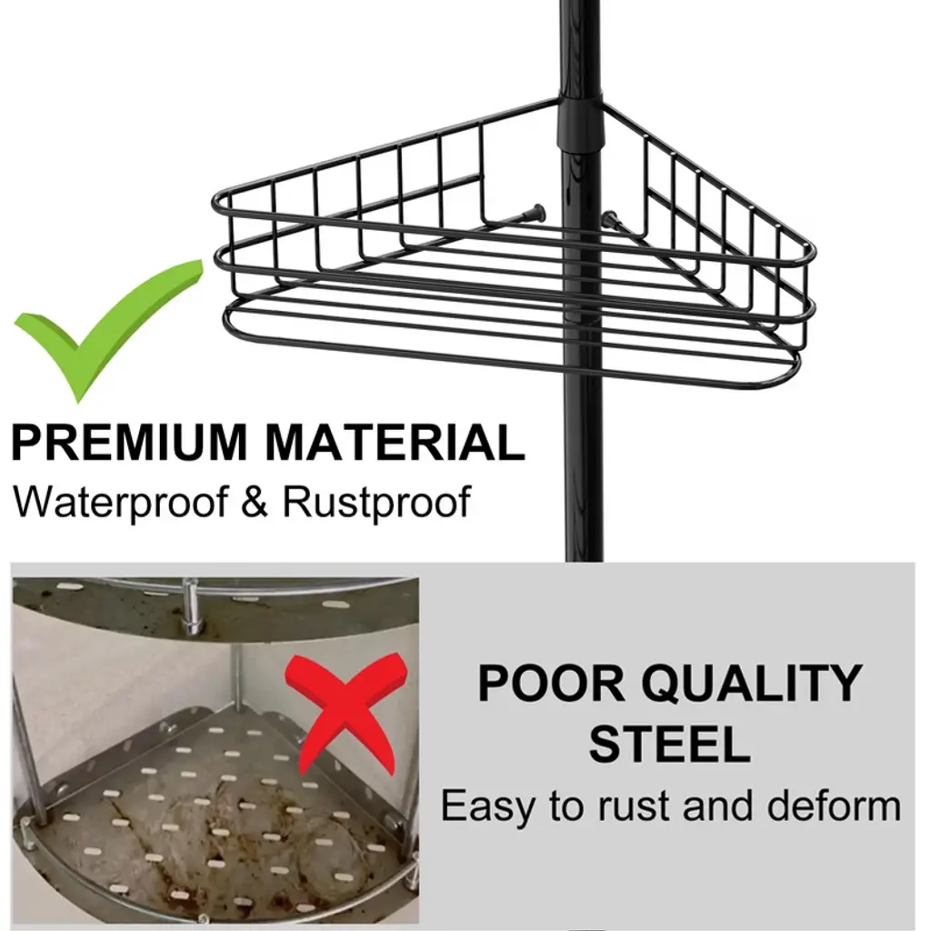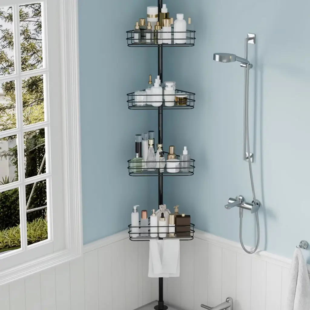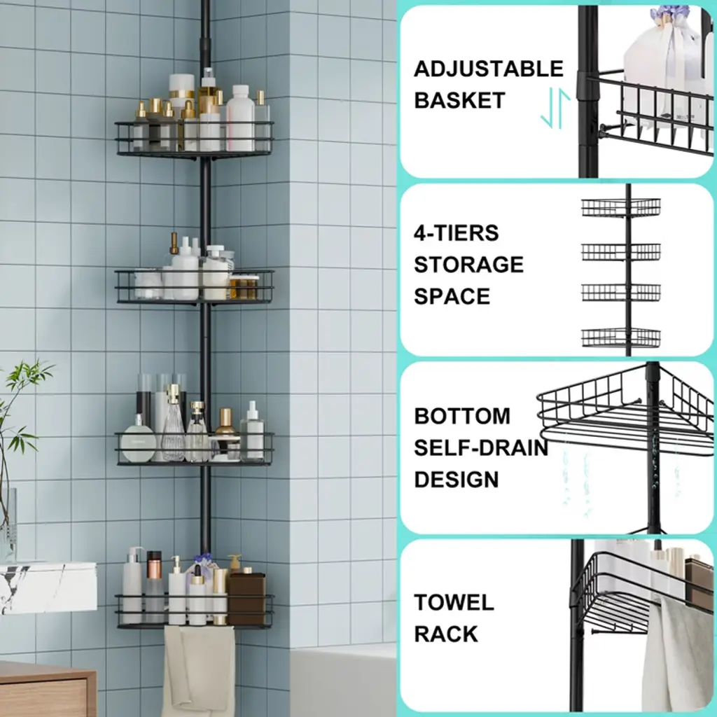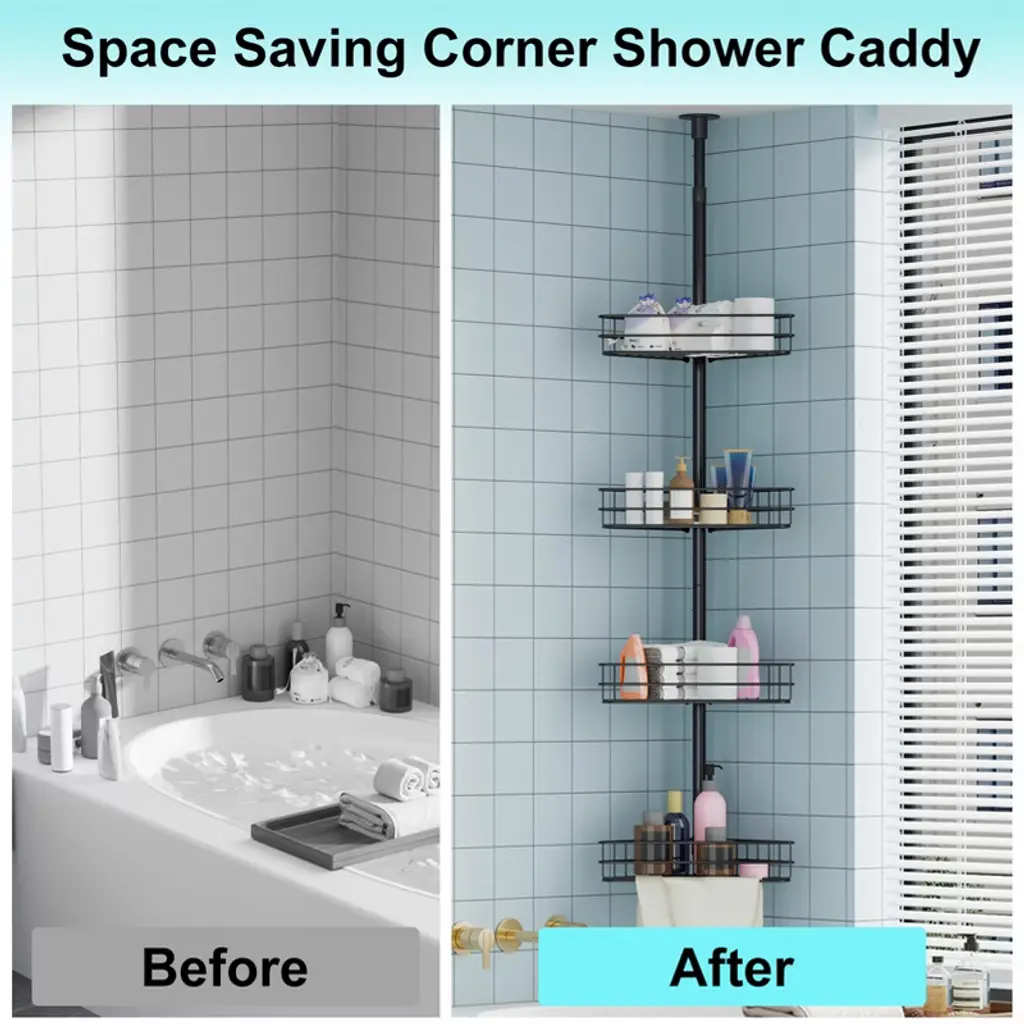 4-Tier Corner Shower Caddy with Tension Pole for BedroomOrganize your bathroom in style with the corner shower caddy, designed with a sleek tension pole that effortlessly maximizes space and keeps all your essentials within reach, transforming your daily routine into a luxurious experience.Key Features at a Glance:-- Four spacious baskets for storing shampoo, conditioner, and body wash. Built-in towel bars for convenient access.-- Hollow basket design ensures proper ventilation and drainage, keeping your bathroom fresh and dry.-- Integrated telescopic rod enhances stability for a secure, wobble-free fit.-- Adjustable height from 75.6 to 110.4 inches, suitable for any shower space, including bathrooms, kitchens, RVs, and laundry rooms.-- Durable construction from premium iron with an electroplated finish, making it waterproof and rust-resistant.Specification:Material: IronProduct Dimensions: 12.91 L x 8.07 D inchesAdjustable Height Range: 75.6-110.4 inchesBasket Size: 8 D x 13 W inchesPacking Includes:1 x Tension Pole Shower Caddy for Bathroom1 x Instruction ManualImportant Note:This shower caddy set is not compatible with sloped ceilings.