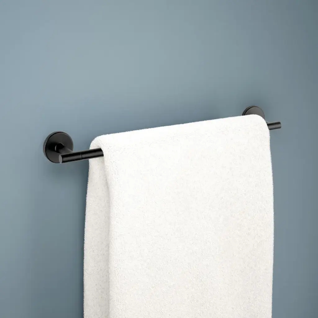 Sleek, minimalistic design makes the Delta Trinsic Bath Collection the perfect complement to today's modern home. Getting ready in the morning is far from routine when you are surrounded by a bathroom that reflects your personal style. This 18 in. towel bar holds a single towel or two hand towels to utilize wall-mounted storage. Complete your space with coordinating pieces from the full collection (sold separately).