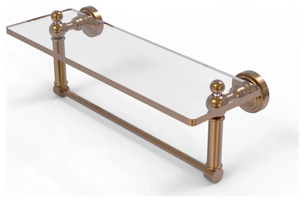 Add space and organization to your bathroom with this simple, traditional style glass shelf. Featuring tempered, beveled-edged glass and solid brass hardware this shelf is crafted for durability, strength and style. One of the many coordinating accessories in the Allied Brass Waverly Place Collection, this subtle glass shelf is the perfect complement to your bathroom decor.Brushed Bronze, a satin-like texture, metallic dark golden finishMade with 3/8" thick tempered glass for safety and strengthCrafted from the Finest Solid Brass MaterialsClever design includes integrated towel barGlass Dimension 16 Inches x 5 InchesDesigner Finish will provide corrosion free performanceProducts are provided with a limited lifetime warranty