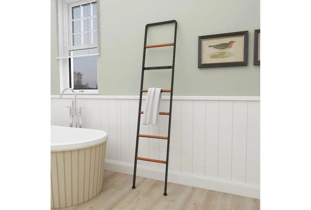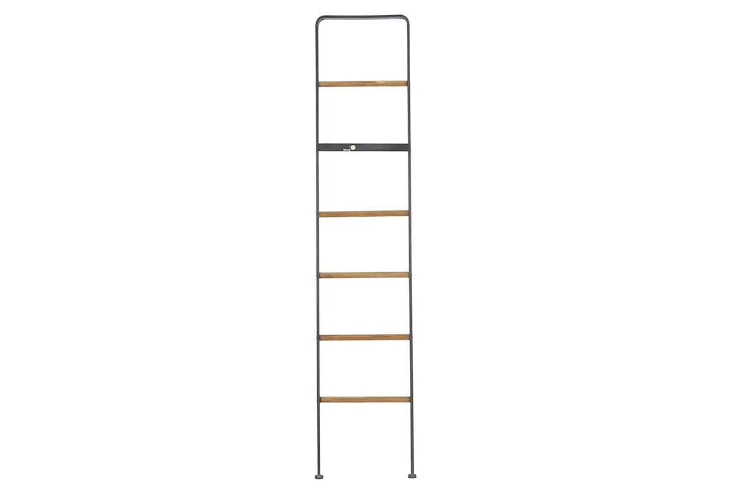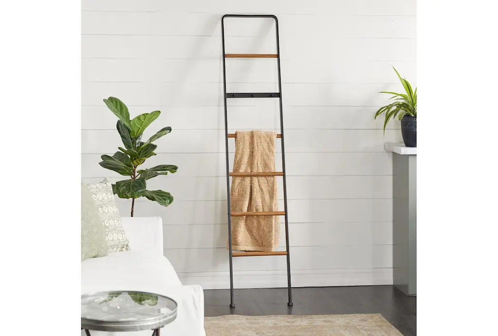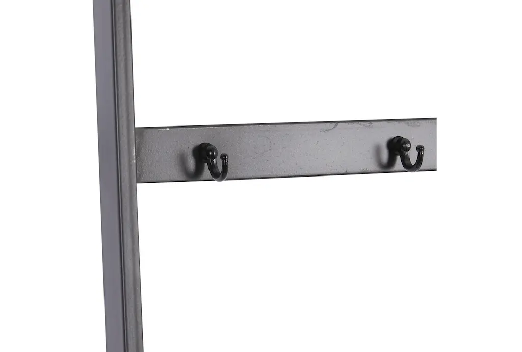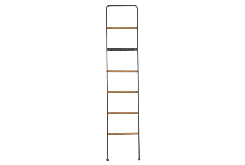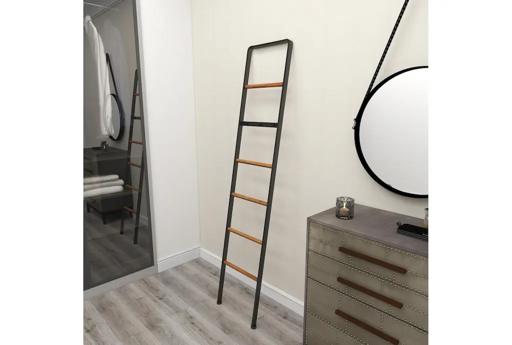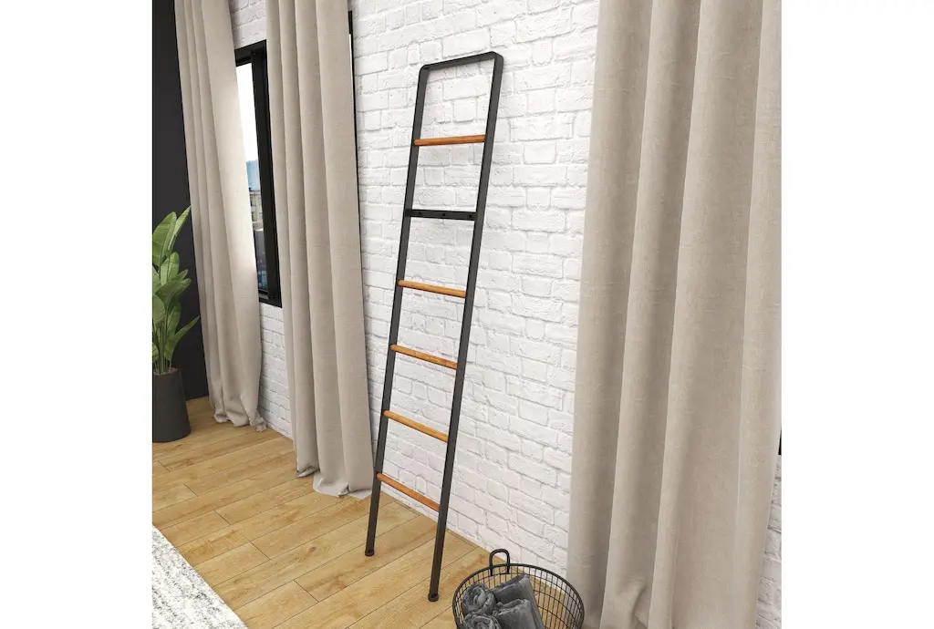 Lightweight and easy to move around, use this ladder to drape clothing in your bedroom and hang a few lightweight items. Maximize your wall space with is ladder stand for additional storage in your home. Ladder can function as a unique rack any where on your wall, this classy appeal can keep your space looking sleek and organized. Designed with felt or rubber stoppers at the base that prevent scratching furniture and table tops, as well as sliding around. This item ships in 1 carton. Use ladder for decoration only. It's not recommended for professional or home improvement use.. Suitable for indoor use only. This item ships fully assembled in one piece. Maximum weight limit is 30 lbs. This is a single black colored blanket ladder. Metal ladder features 6 shelves. Contemporary style.