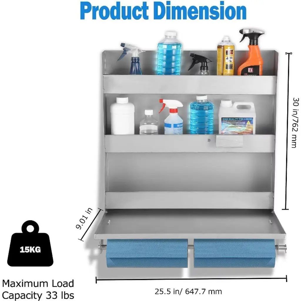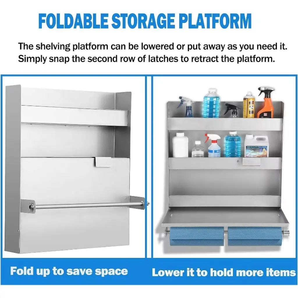 DURABLE & LIGHTWEIGHT: Made from rust-resistant aluminum, this cabinet organizer combines a sleek design with long-lasting durability and a maximum load capacity of 33 lbs for optimal garage organization. SPACE-SAVING Tool Cabinet: This storage cabinet features a foldable platform that serves as a workbench. Fold it away when not in use to maximize your workspace. INTEGRATED PAPER TOWEL RACK: Equipped with a spring-loaded paper towel tensioner, the cabinet holds two rolls, keeping cleaning supplies accessible for a tidy workspace. VERSATILE STORAGE SOLUTION: Ideal for garages, trailers, and workshops, this aluminum cabinet ensures your tools and supplies are conveniently organized and accessible. EFFICIENT GARAGE ORGANIZATION: Easy to install with included hardware, this lightweight wall-mounted cabinet securely fits various wall types, simplifying your garage setup.