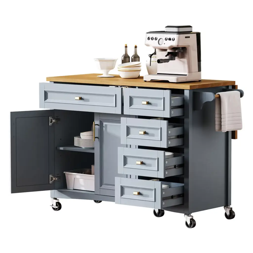 Oversized 52'' kitchen island combining vintage charm with modern functionality. Features a foldable drop leaf for extra workspace, two spacious cabinets, five drawers with smooth metal slides, adjustable interior shelving, and convenient spice and towel racks. Mounted on 360¡ã swivel wheels for easy mobility, this island provides a versatile prep and storage solution while adding a stylish touch to your kitchen.