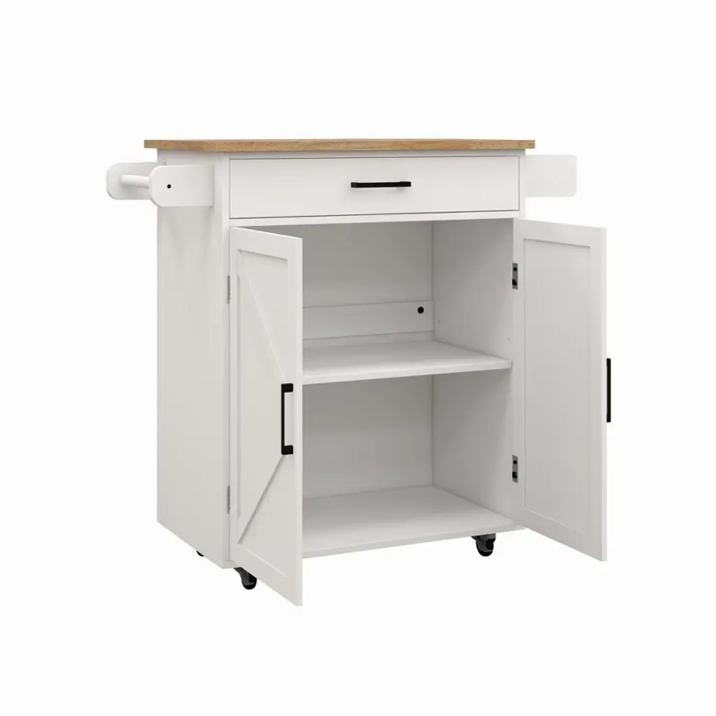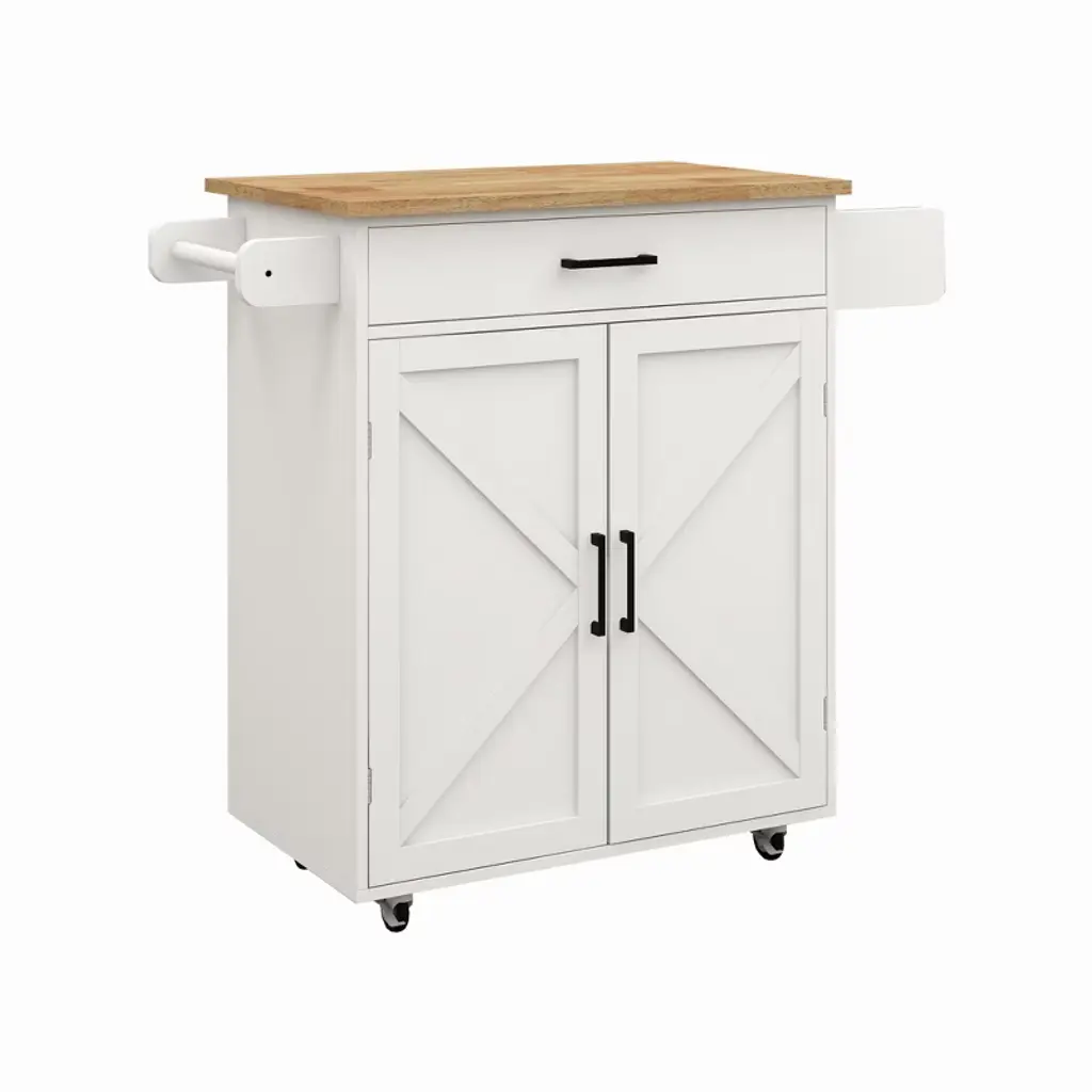 Transform your kitchen with this versatile Kitchen Island Rolling Trolley Cart, featuring a stunning rubber wood table top and a sleek white finish. This beautiful cart not only adds functionality to your kitchen but also lends an air of charm. With adjustable shelves, you can easily customize the space to fit your culinary needs. Thanks to the built-in towel rack and seasoning rack, everything you need is conveniently within reach. Made from high-quality E1 MDF and coated with environmentally friendly UV paint, this cart is designed to last and look great. Plus, with its smooth-rolling wheels, you can effortlessly move your cart wherever you need it. Perfect for small kitchens or as a stylish serving solution for gatherings!