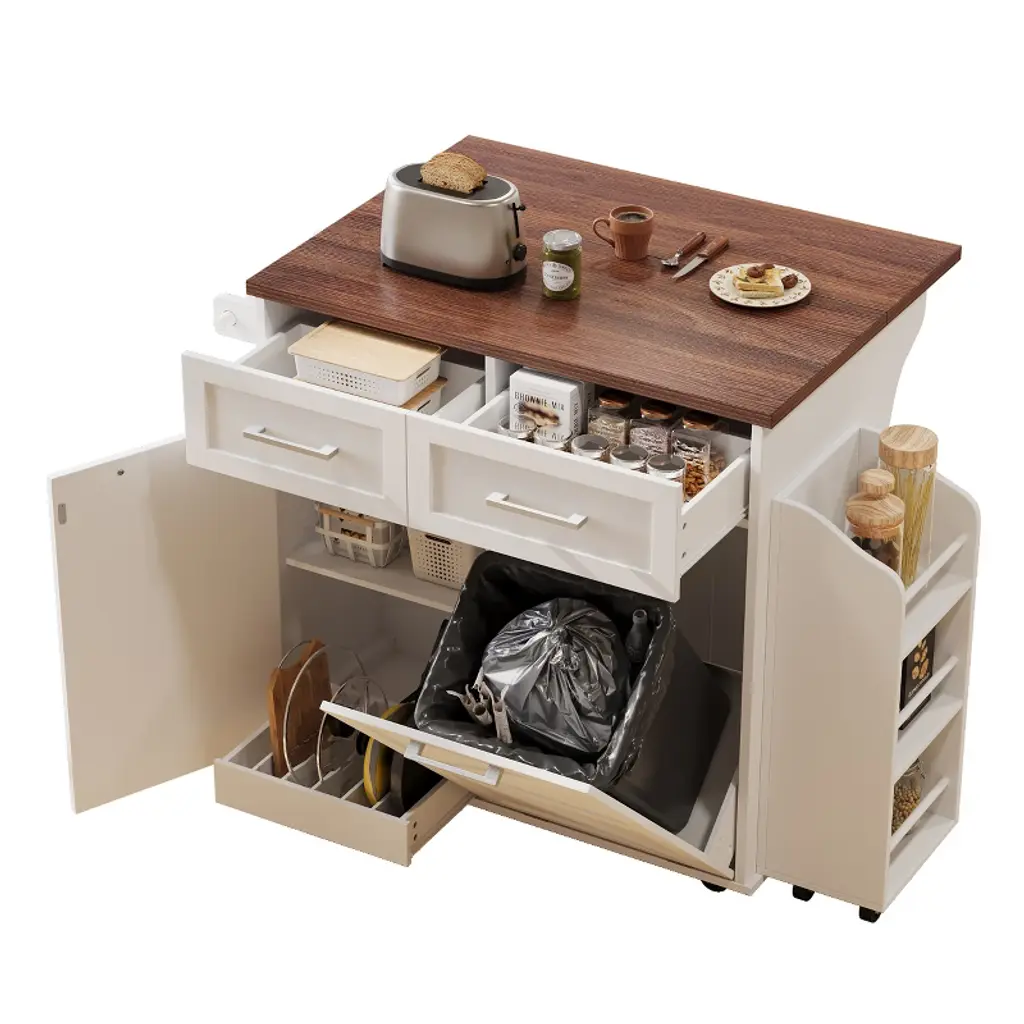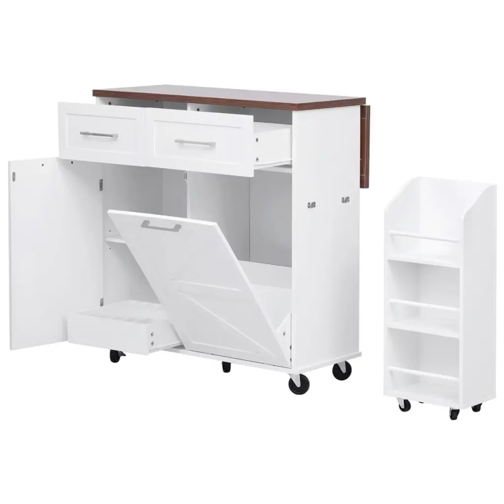 Transform your kitchen with our elegant Kitchen Island with Drop Leaf, designed to combine functionality with a touch of farmhouse charm. Measuring 47.2 inches in width, this practical kitchen cart features ample storage, including two deep drawers, a concealed tilt trash can cabinet, and two removable side racks for versatility. Crafted from high-quality MDF, it supports up to 300 lbs, ensuring durability and longevity. Its adjustable shelves and drop leaf design provide extra workspace when needed and fold away to save space when not in use. Enjoy the perfect balance of style and efficiency in your kitchen with this charming and functional addition!