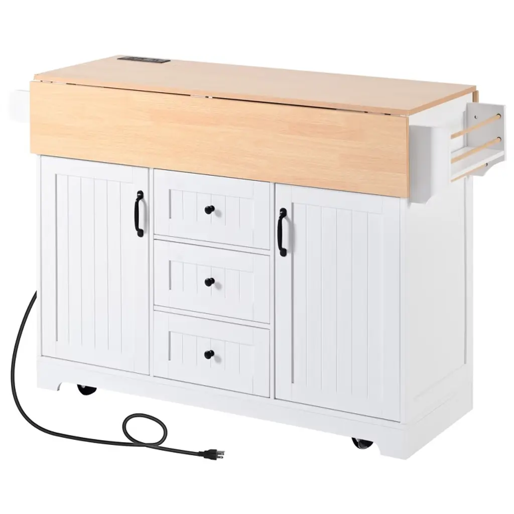Transform your kitchen space with our elegant Large Kitchen Island, designed for versatility and functionality. Measuring an expansive 55.7''W x 34''D x 36.5''H, this island features dual drop leaves for seamless transitions from a generous dining table to a stylish workstation. Crafted from CARB Phase II certified MDF, this sturdy cart not only offers a generous weight capacity but is also equipped with a built-in charging station featuring 2 AC and 2 USB outlets, ensuring your kitchen appliances are always powered. With ample storage options, including 3 deep drawers and adjustable shelves, you can easily keep your essentials organized. The mobility provided by its hidden wheels allows for easy movement, or you can opt for a stationary setup for added stability.