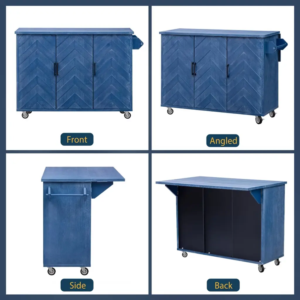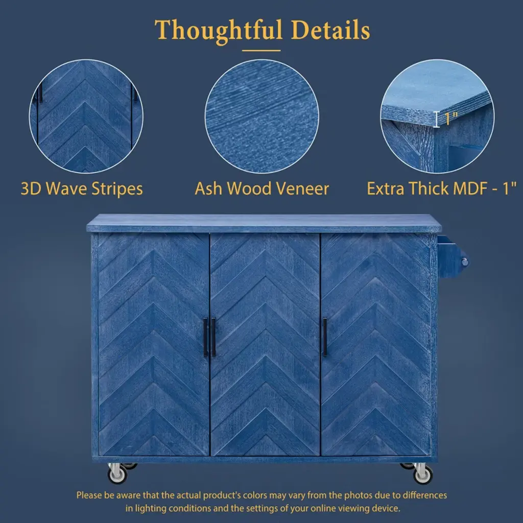 Elevate your kitchen with this farmhouse-style kitchen island featuring a stunning 3D wave-striped door and retro distressed craftsmanship. Built with a scratch-resistant ash veneer finish and sturdy MDF frame, it offers a spacious drop-leaf countertop, internal storage racks, and adjustable shelves. Equipped with both rolling wheels and optional solid wood feet, this mobile and stationary island is ideal for kitchens, dining rooms, or multipurpose spaces.