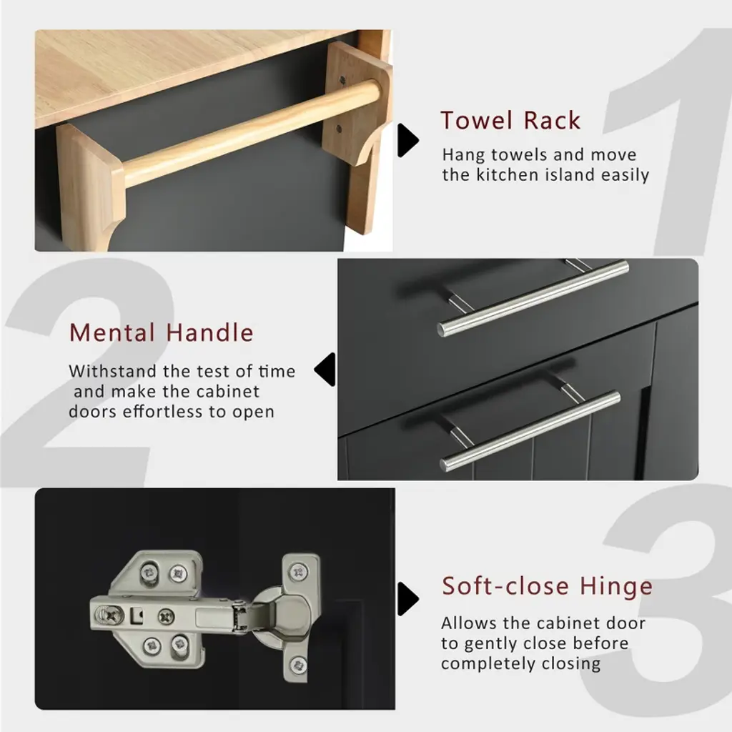 Upgrade your kitchen storage and workspace with this multifunctional kitchen island featuring a foldable drop-leaf rubber wood countertop and a 3-tier pull-out organizer. With adjustable shelves, internal storage racks, and smooth-rolling wheels, this island is built for convenience and style. Crafted from sturdy MDF and solid wood, it combines form and function, perfect for kitchens, dining rooms, or multipurpose living spaces.