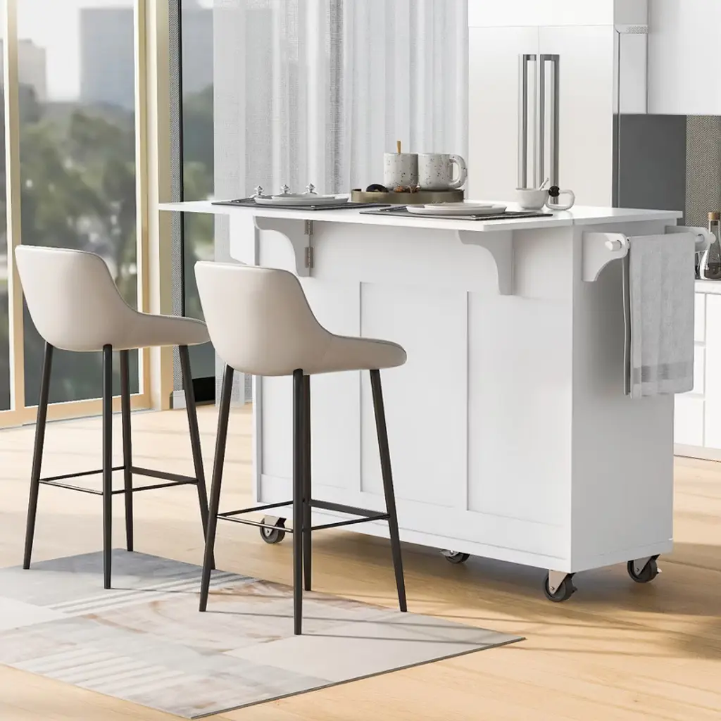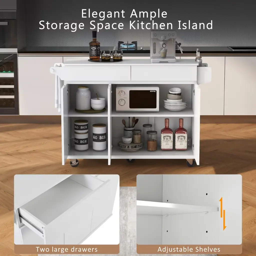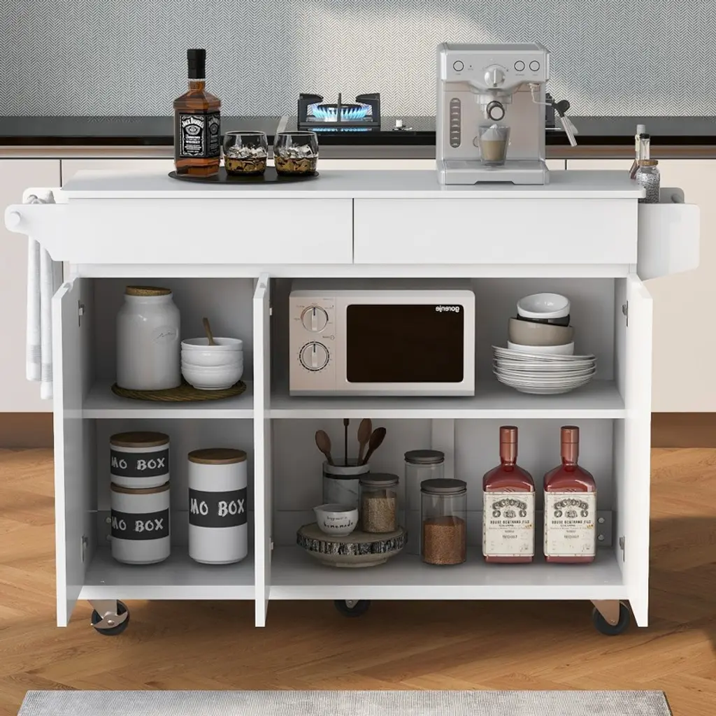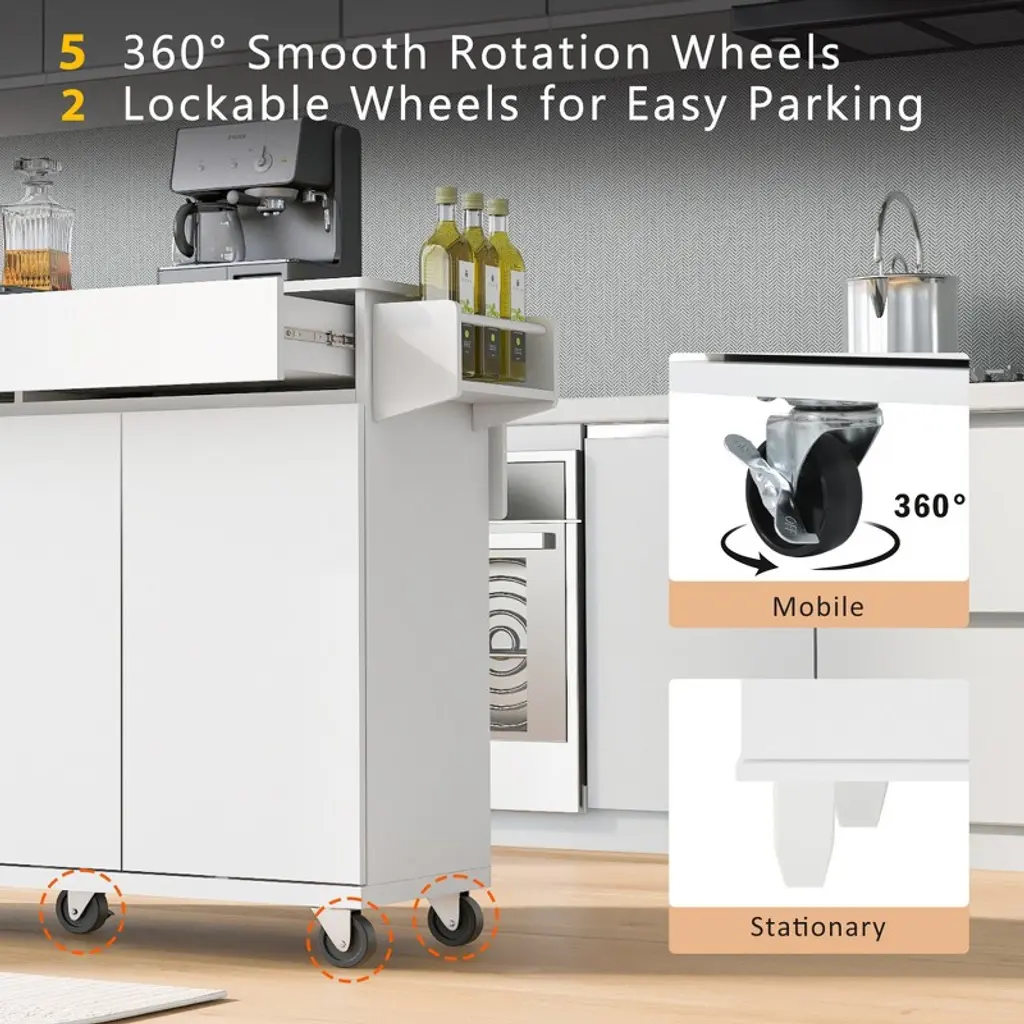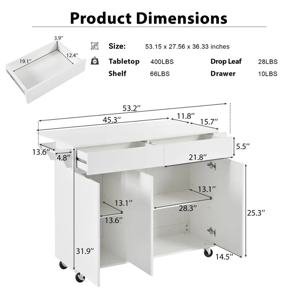 This multifunctional kitchen island blends simple elegance with smart functionality. Featuring a clean, solid-color design, it offers a spacious drop-leaf top, two drawers, three cabinets with adjustable shelves, and side racks for towels and spices. Built from durable MDF with five lockable wheels and optional stationary feet, it¡¯s the perfect addition to modern, space-conscious kitchens.