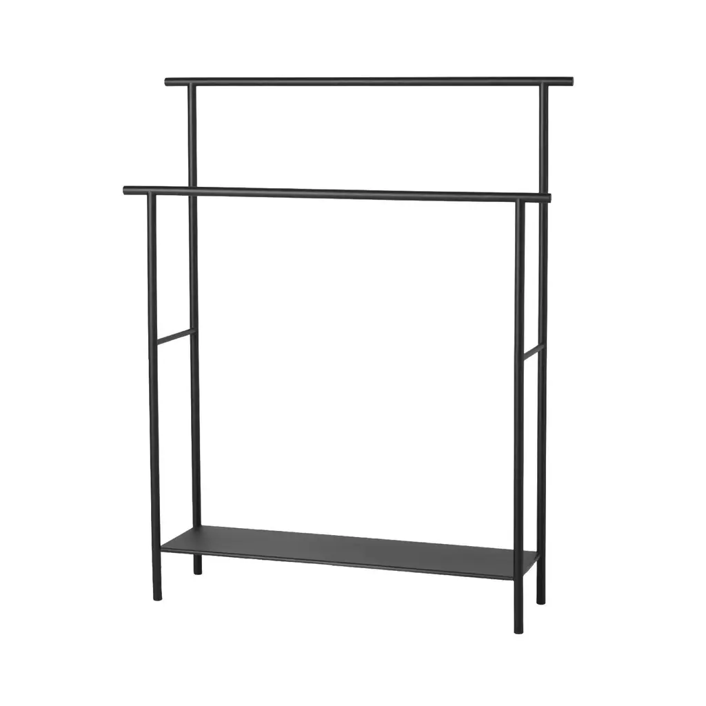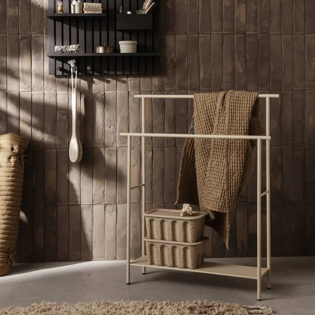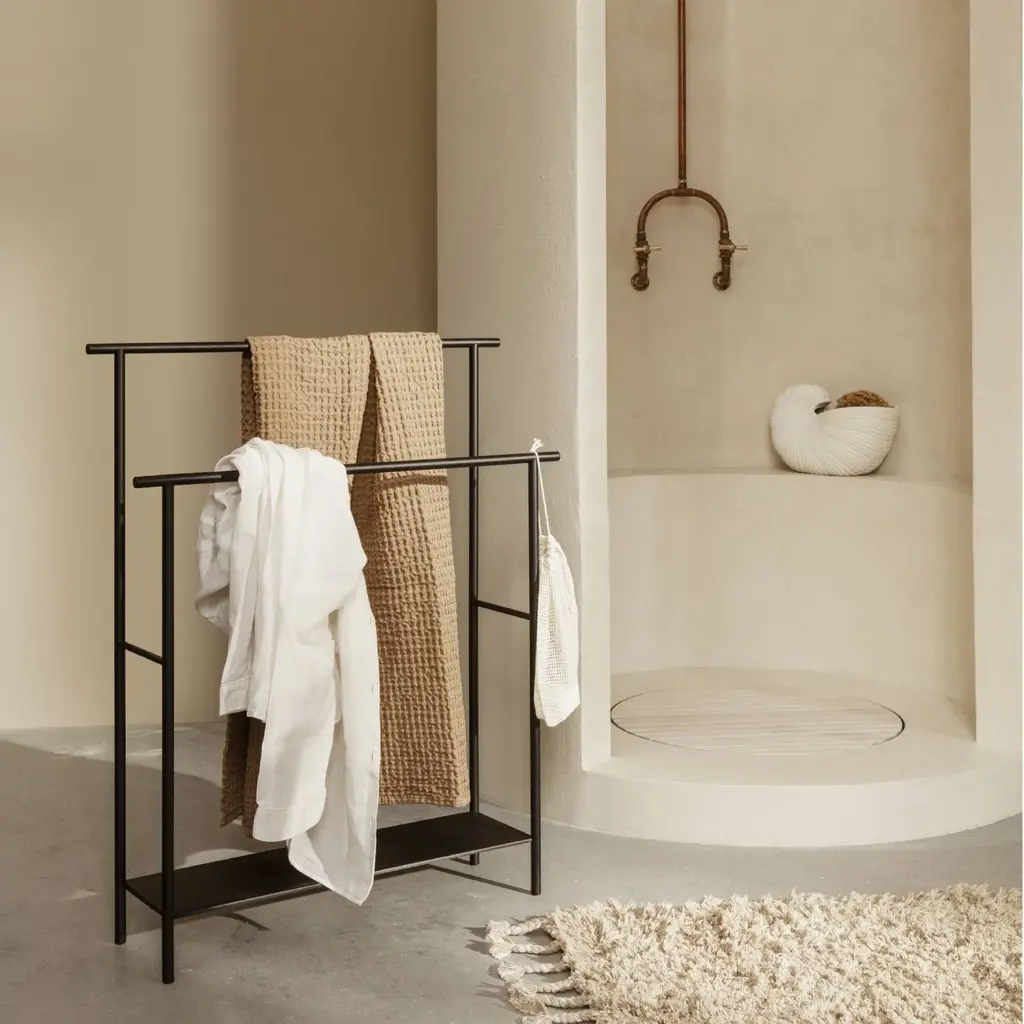 The Dora Towel Stand offers a practical solution for organizing towels in your bathroom. Constructed from powder-coated metal, it is rust-resistant and suitable for damp environments. Its design allows for hanging multiple towels simultaneously, with an additional lower shelf for extra storage. The stand is available in finishes Black and Cashmere.