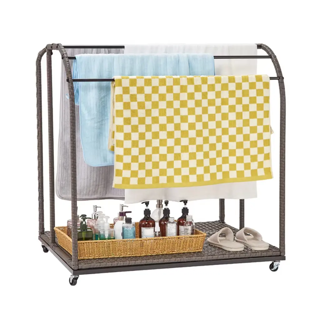 Garvee Pool Towel Rack,Outdoor Pool Storage Rack with Rattan Base and 5 Towel Bars,Pool Float Storage with Compartments, Store Buoys, Pool Floats, Swimming Rings, Suitable for Outdoor/Indoor.Boasting dimensions of 37.4"L x 31.5"W x 37.4"H, this pool storage rack is equipped with four movable casters and a sturdy rattan base, making it easy to relocate and store any pool accessories you may need