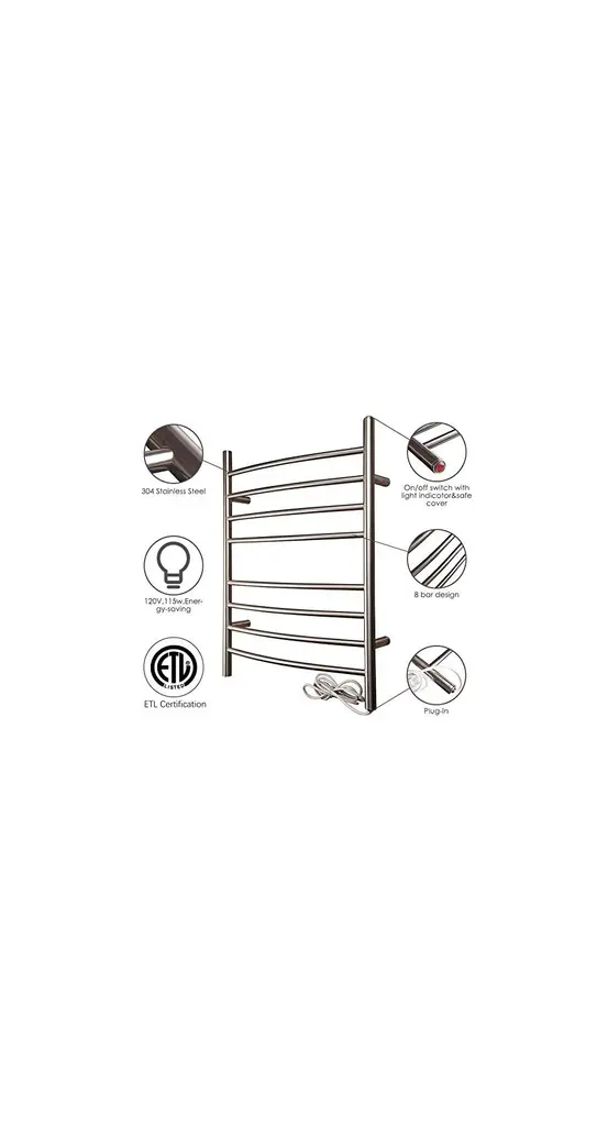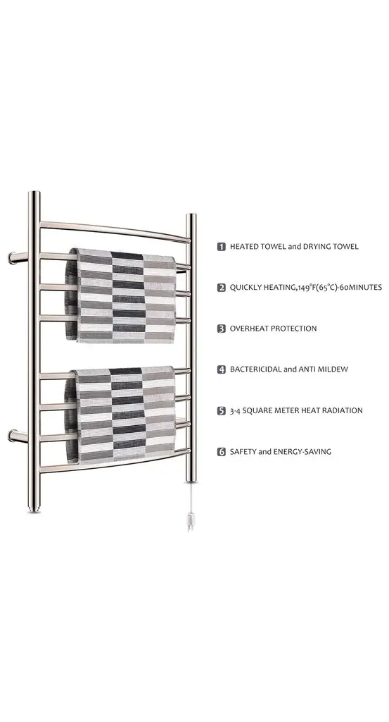 SpecificationBrand Name: HeatgeneOutlet: 120VPower consumption: 115 WattsMaterial: Stainless steel 304Size: 31.5X24 inches(800*600mm)Finish: Brushed Polish, Mirror Polish, Matt BlackStyle: Plug-inTemperature: 149°F(65°C)Feature: HeaterType: Towel RacksUsage: Home Bathroom,Hotel, Spa, etcFeaturesEasy to clean, stainless steel constructionSophisticated process equipment keeps the streamlined tubes naturally smoothThis product is light enough that can be easily installed and disassembled by yourselfThe weld is smooth and clean with the robot welding and unique brazing processEasy installationQuick heat up time, and evenly distributed heat for optimal warmthPower saving, safetyPackage Includes1 x Heated Towel Warmer1 x User ManualProduct DescriptionThe Heatgene towel warmer make it simple to turn any bathroom into a luxury spa. The wall mounted towel warmer also make it ideal for bathrooms with limited floor space.No noise, no smell, no dustSpecific Design of Radiation Heat Dissipation in an Enclosure with HomogeneousUltra-low Energy Consumption, absolute zero pollution, energy saving and environmental protection.Early Morning Convenience of Warmed Towels,It’s perfect for the work week!This product is integrated with German heat dissipation technology and Italian electric heating technology, and it has been patented for design and use.Curved Bar DesignThe Heatgene towel warmer’s curved design is convenient for hanging towel and uses 8 bars to evenly distribute heat, warming up to 2 large towels or bathrobes. The color will fit any decor. You can put multiple items on it at once, but not overlapping, making it ideal for warming up towels. Your family will get cozy towels whenever they step out of the shower.Fast Heating & Overheat ProtectionIt warms towels in15 minutes after you switch it on and can reach optimum temperature of 149°F in 60 minutes, drying a wet towel in 2-8 hours. Its thermostat can keep its temperature at 149°F(65°C), which saves energy. It won’t overheat or cause towels to burn. It is safe with anti-scald, antibacterial, and anti-mildew features. It is designed to run 24-hours a day. (Note: Actual temperature will depend on the surrounding temperature & humidity)Space saving & Wall MountedThe towel warmer is a perfect towel heating solution for homes. This is a wall-mounted and Plug-in towel warmer that you can install on the wall. It’s design maximizes the space of your floor space.modern style, suitable for space of your home bathroom, hotel, spa and even for the outdoor area.Not only a perfect towel heater, but also a wonderful bathroom decorationEasy Installation and CleanThe towel warmer is easy to clean and made of durable 304 stainless steel with either brushed or mirror polish finishes. All necessary hardware and tools are included in the package, and it is easy to install with its included instructions. The towel warmer is powered by a standard electrical outlet (rated voltage: AC 120V/60Hz)Two Year Warranty2 year warranty is covered by our manufacturer’s warranty for peace of mind