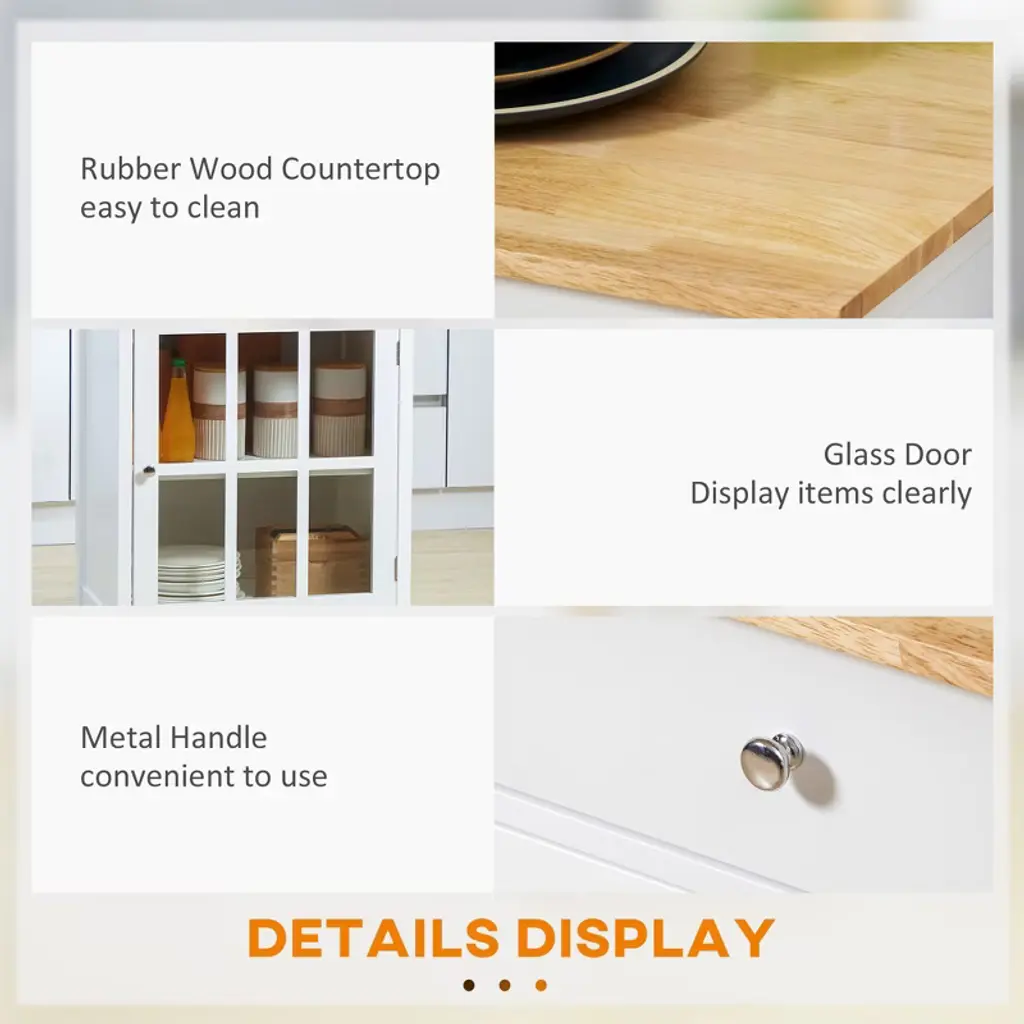 Versatile Storage: Do you have too many utensils and too much silverware to fit in your drawers? This microwave cart features a drawer, a glass framed door cabinet and a towel rack, providing a multifunctional storage solution from small accessories to kitchen utensils and food supplies.Adjustable Shelf: Want flexibility in storage? Well, the adjustable shelf is designed for them. You can easily adjust the height to suit your needs.Rubber Wood Top: Need more elbow room or additional counter space for food preparation? This kitchen island on wheels will do the job. With a rubber wood surface, the butcher block gives you an instant workspace.Easy Mobility: This small kitchen cart has 4 caster wheels to move around your kitchen and 2 brakes to hold in place while you're using it. The towel rack can be also used as a transport handle.Rolling Kitchen Island Information: 26.5" W x 19" D x 34" H, Weight Capacity: 110 lbs. (Overall), 22 lbs. (Shelf), 11 lbs. (Drawer).