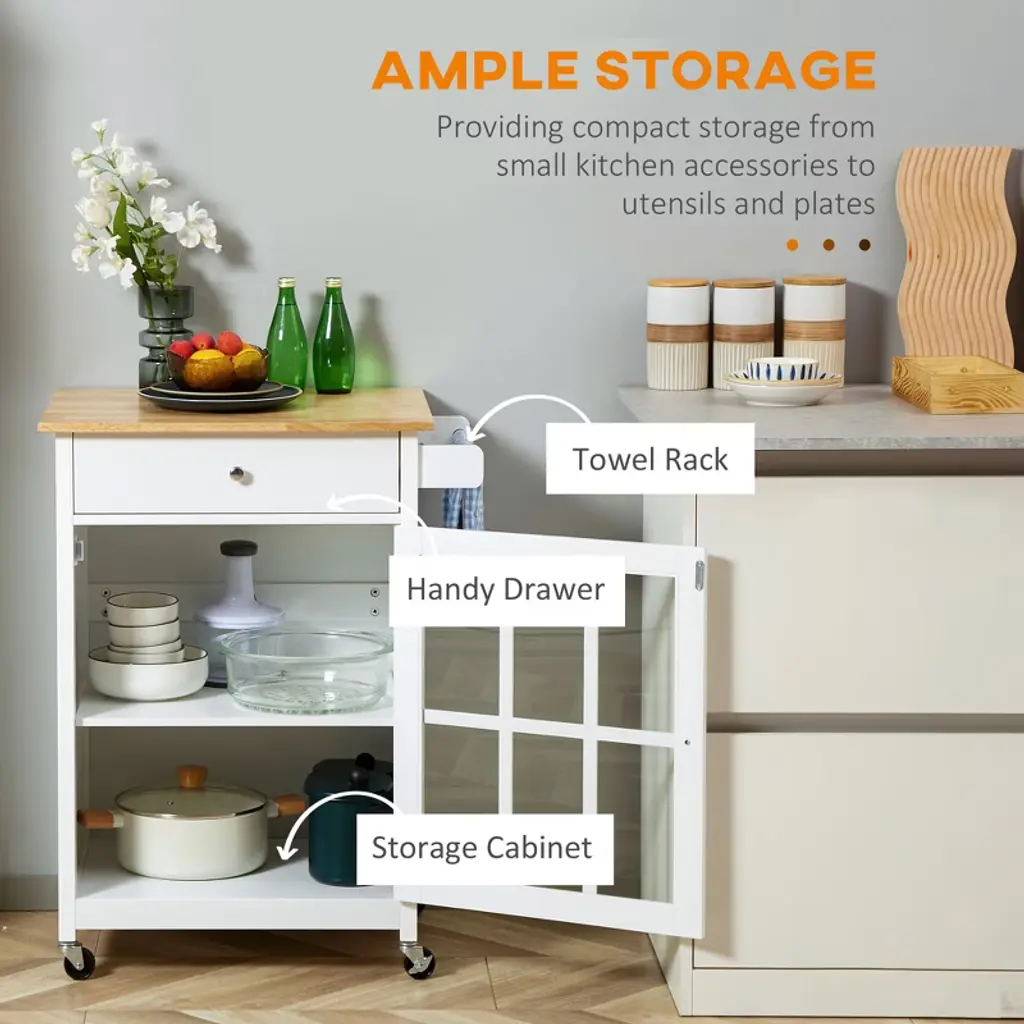 Homcom 27" Rolling Kitchen Island Cart With Drawer And Glass Door Cabinet, Kitchen Trolley With Adjustable Shelf And Towel Rack, White