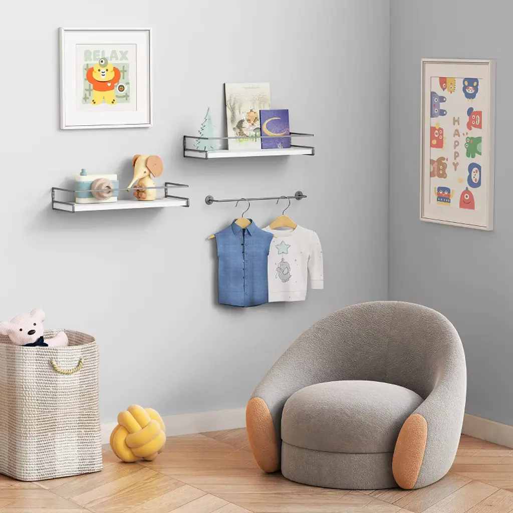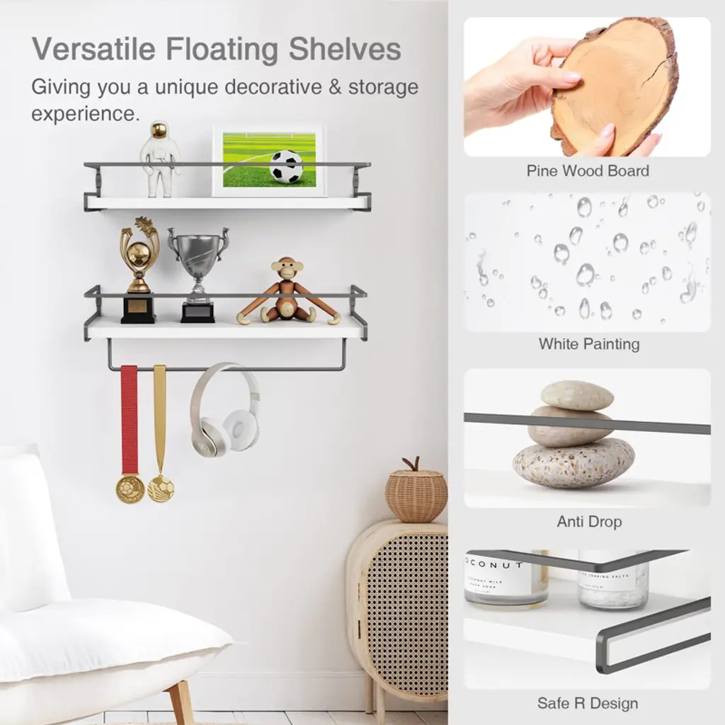 Looking for a practical and stylish storage solution? Our floating shelves are the answer. Crafted from high - quality painted pine wood with waterproof properties and durable gray metal brackets, they can bear up to 30 lb. These pre - assembled shelves are easy to install and disassemble. The separate gray towel bar allows for customization. In the bathroom, install them over the toilet to free up countertop space, holding toiletries, shampoos, and decor. They're also great for bedrooms, kitchens, and home offices. With a timeless white and grey finish, they add a decorative touch to any room. Whether it's for your small apartment or as a gift for a friend, these shelves are a must - have for organizing and beautifying your space.