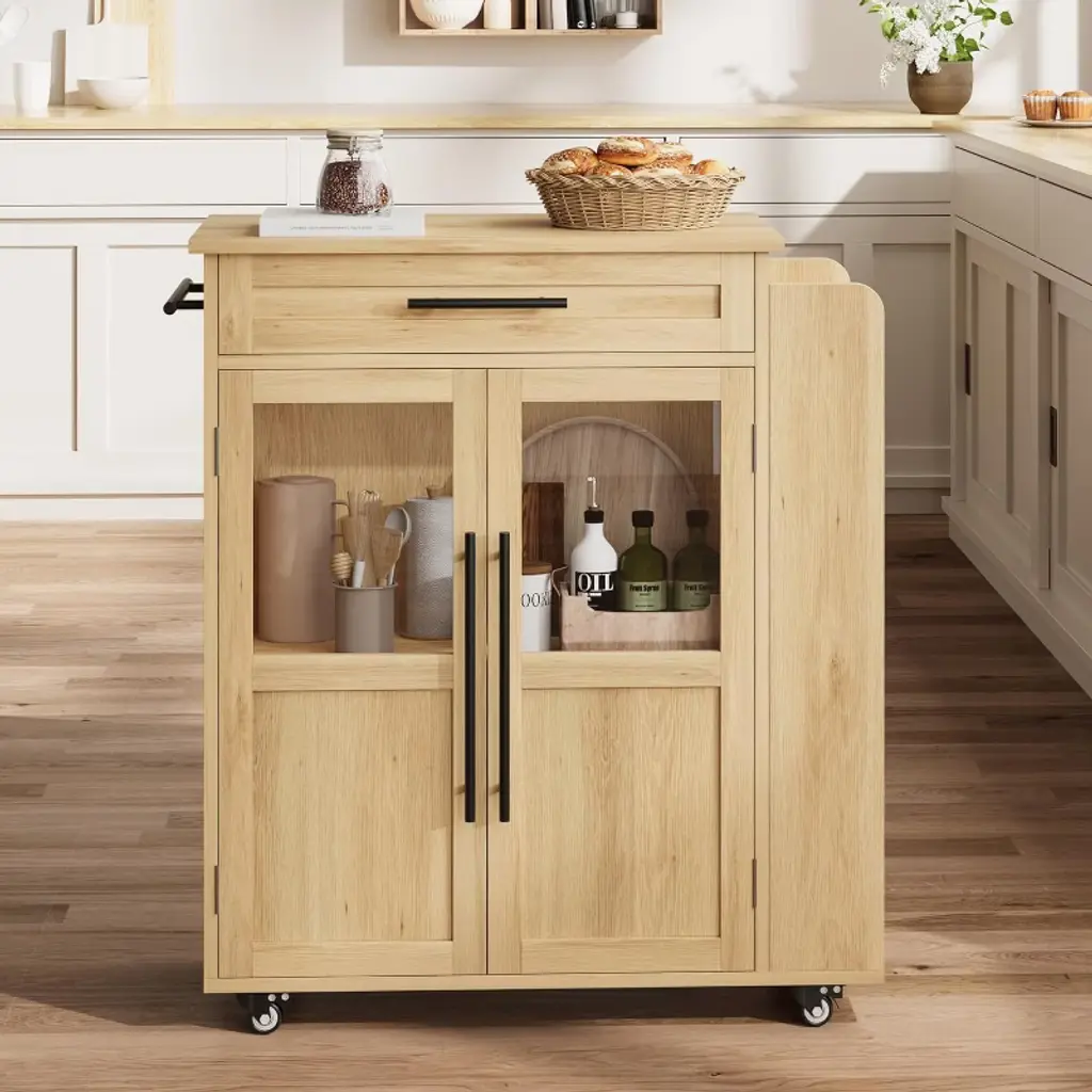 Optimize your kitchen space with this stylish and functional kitchen island cart. Featuring a solid wood top, 4-door cabinet with adjustable shelves, two spacious drawers, spice rack, and towel rack, this cart provides ample storage and easy access to your kitchen essentials. The locking wheels offer stability and mobility, making it perfect for any kitchen. Its durable wood frame and sleek black finish make it a timeless addition to your home.