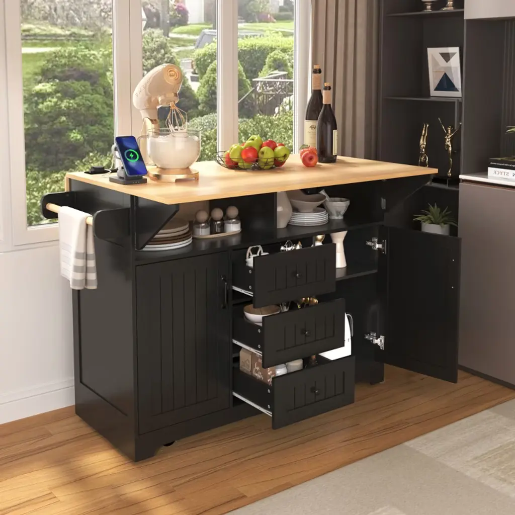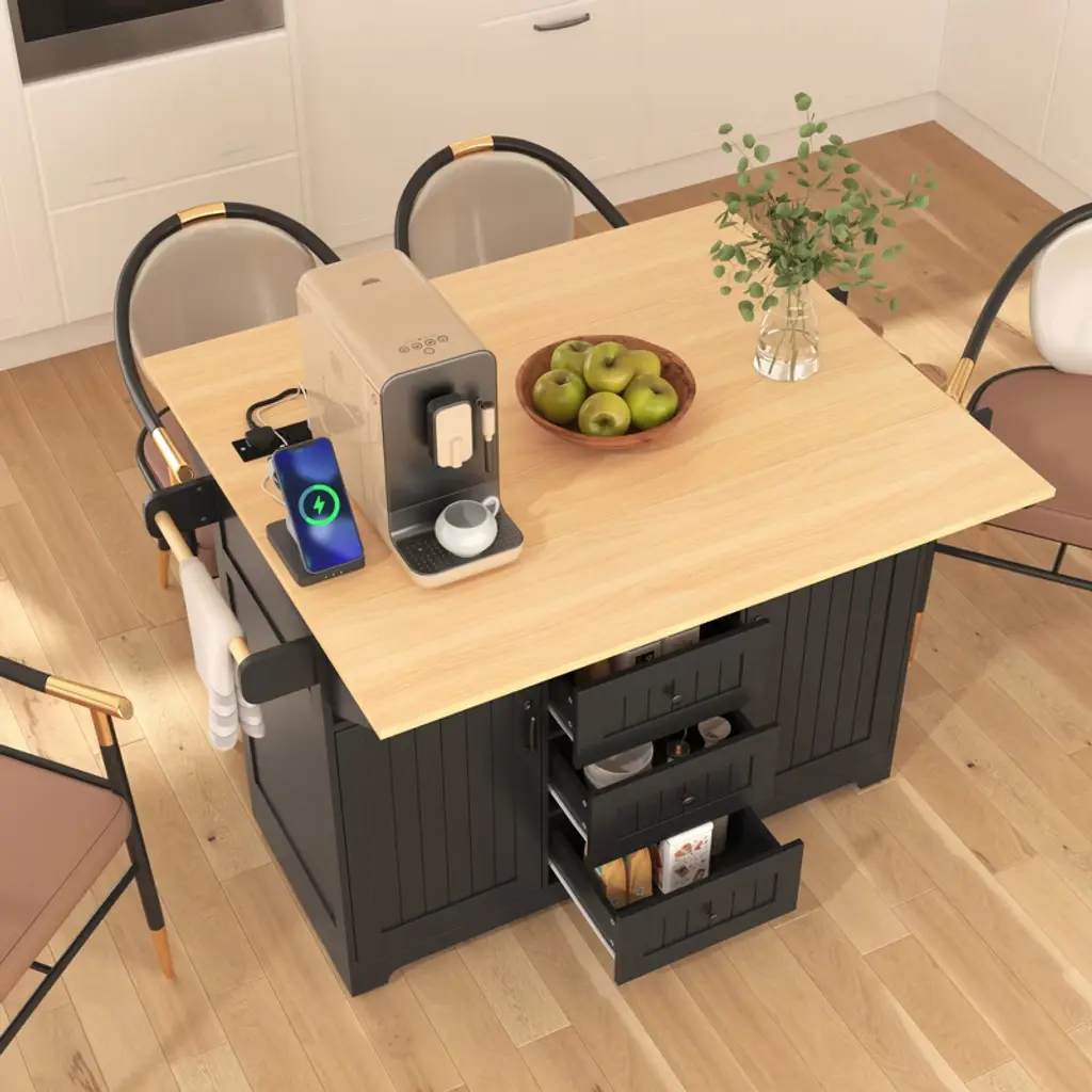 Work Bench Just folding one tabletop, it could be as an office desk place your computer, books, or camera on the tabletop, or even as an entryway table when fully folded. Kitchen & Dining Table As a dining table, it is the perfect fit for a family of 4-6 when totally extended. Console Sideboard When folded up, it can be neatly stowed in a corner, making it ideal for small living spaces like apartments,helping to keep your kitchen or living room tidy Power Supply This exquisitely designed kitchen cart features a sophisticated built-in charging station, boasting 2 AC outlets and 2 USB ports to effortlessly accommodate all of your kitchen appliance power requirements. Hidden Wheels This mobile kitchen island on wheels is equipped with 5 universal wheels, 2 of which are lockable. The central placement of one wheel at the base ensures enhanced overall stability during movement. Adjustable Shelves Height-adjustable shelves inside the cabinet doors provide flexibility in accommodating various kitchen items of different sizes. Sturdy Base The strong island base is essential for providing stability and support for the entire cart structure. You can choose to use wheels or not apply wheels as a stationary side cabinet or island. Open Storage Shelf Middle open storage compartments support more space for different often-used items. Groove Barn Door The design of the groove barn door combines traditional and modern farmhouse styles, giving the cabinet a simple and rustic look. Sturdy Drop Leaf Support This Kitchen island features a versatile double-sided folding design, allowing for seamless transitions between the dining table, kitchen island, or workstation configurations as needed. Spice Rack This kitchen cart also have towel rack and a spice rack to keep your desk tidy. Highlights&Summary Highlights [Folding Dinning Table][Middle open storage compartments] [Large Kitchen island with 47¡±x34¡± D Table][2 Drop Leaf][2 Doors + 3 Deep Drawers] [Ample Storage Space][Power Outlet 2AC 2USB] [5 * 360¡ãHidden Smooth Rotation Wheels with 2 Lockable] [Eco-friendly manufactured P2 MDF Board] [Spice Rack &Towel Rack][Adjustable Shelves] Summary The dual drop-leaf kitchen island fuses classic style, high-end details, and versatile storage. Crafted from CARB Phase II certified MDF boards, its 47''W x 34''D large countertop features a smooth, scratch-proof laminate finish table that can switch between dining table, kitchen island, or workstation configurations as needed. With a drop leaf, power outlet, and locking wheels, this kitchen cabinet offers versatility and mobility. It's pretty cool to have this kitchen island cart that can fold up easily but also convert into a dining table for 4 or even a side table for 2-3. Specifications Product Dimension(Overall) 55.75 x 34 x 36.5 inches Product Weight 104.94 LBS Package Dimension 52.8 x 20.25 x 9 inches Package Weight 114.09 Detail Product Dimension Please refer to the size image Number of Package 1 Tabletop Weight Capacity 400LBS Drawer Weight Capacity 10 LBS Shelf Weight Capacity 75 LBS Drop Leaf Weight Capacity 33 LBS Material P2 Grade Environmental MDF Country of Origin China Estimated Time to Assemble 40-60 minutes Product Notice Product Care Notice 1. Wipe with a soft dry cloth. Avoid the use of harsh chemicals and household cleaners as they may damage the finish. 2. Hardware may loosen over time; periodically check that all connections are tight. Color Notice Real Product¡¯s Color may be a little different from the image due to the lighting or monitor¡¯s display. Size Notice Manual measurement has been used, there may be some reasonable error.