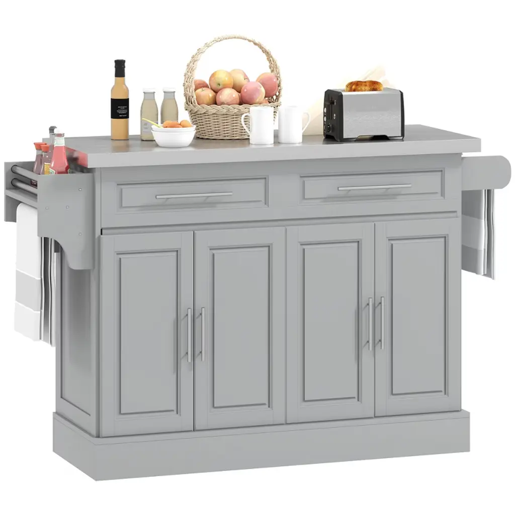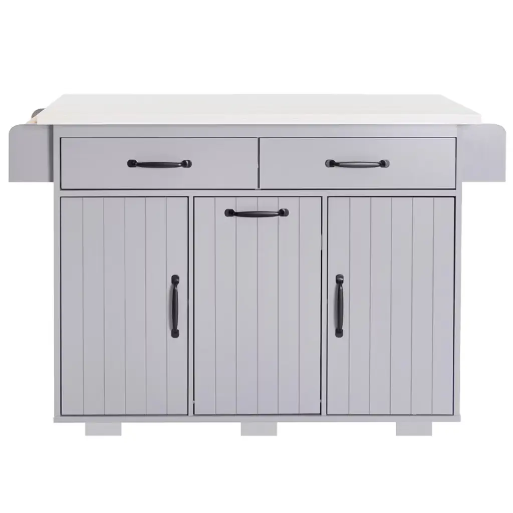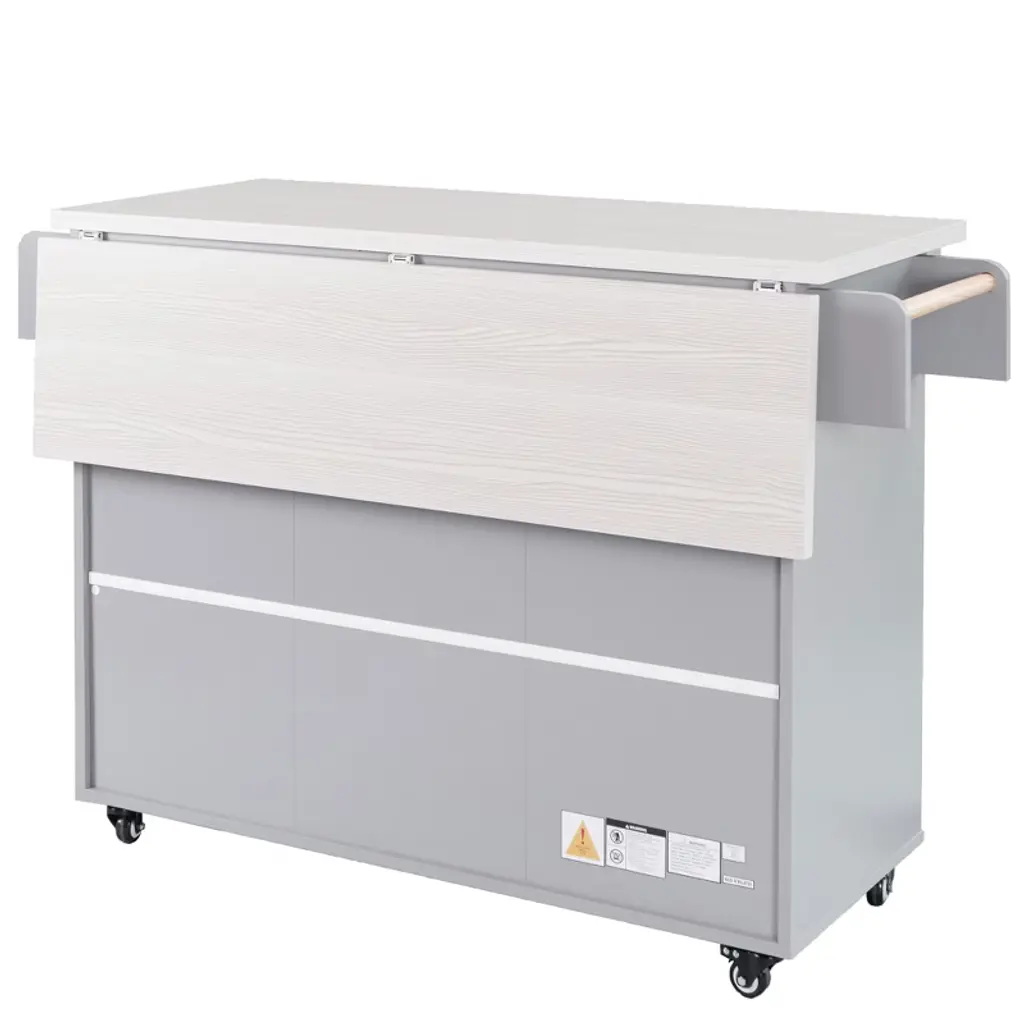 Multipurpose Tilt-out Trash Can In addition to being used for kitchen waste, this bin can also store pet food, the hidden design won't allow pets to rummage around, and when used indoors, it can also store some clothes that need to be washed. No odors will leak out when the cabinet door is closed, making the room cleaner. Mobile&Stationary Kitchen Island This mobile kitchen island on wheels is equipped with 5 universal wheels, 4 of which are lockable. Additionally, we offer six stationary cabinet feet as an alternative option if you prefer a stationary cabinet setup. Large Drop Leaf The kitchen cart with a drop leaf countertop, the drop leaf can be opened or folded freely according to the needs of use and environment. When you don't need it, you can fold it and place it against the wall, which saves storage space and makes space management easier. Adjustable Shelf The shelf inside the storage cabinet is designed to be 3-level adjustable for catering to your needs of storing items varied in size. 9-gallon Trash Can It can house a 9-gallon trash can (not included), measuring 12" x 11.65" x 15.75" can meet most of the needs, and can tilt out up to 35 degrees. Study Support Our white kitchen island's collapsible drop leaf design with sturdy support makes it perfect for compact spaces,seamlessly transforming into a bar cart or mobile coffee center. Wood Grain Table Top The wood grain table top is made from high-quality and environmental P2-grade particleboard with a beautiful and intricate grain pattern. The rich tones and textures of the wood create a warm and inviting atmosphere in your kitchen. Highlights&Summary Highlights [Ample Storage Space][Drop Leaf] [Multipurpose Tilt-out Trash Can][Adjustable Shelf] [5*360¡ãSmooth Rubber Wheels][Stationary Cabinet Feet] [Towel Rack][Spice Rack][Two Doors + Two Drawers] [Metal Hinges] Summary This kitchen island brings significant savings to your cooking space and indoor storage. Constructed from P2 Grade Particleboard, stripes on the cabinet doors give it an attractive look. The multipurpose tilt-out trash can it carries is a great feature of the product, with two drawers, two cabinets, and a spice rack and towel rack, your kitchen essentials will no longer be cluttered. The rolling kitchen cart sits on lockable casters for easy mobility and stability. The thoughtfully designed drop leaf can be opened and folded. In addition, there are adjustable shelves for your flexible storage needs. Specifications Product Dimension(Overall) 51.06 x 20.55 x 35.04 inches Product Weight 116LBS Package Dimension 49.1x 22.2 x 8.7 inches Package Weight 122.5 LBS Detail Product Dimension Please refer to the size image Number of Package 1 Tabletop Weight Capacity 300 LBS Trash Cabinet Weight Capacity 15 LBS Shelf Weight Capacity 64 LBS Spice Rack Weight Capacity 11 LBS Material P2 Grade Particleboard Country of Origin Malaysia Estimated Time to Assemble 40-60 minutes Product Notice Product Care Notice 1. Wipe with a soft dry cloth. Avoid the use of harsh chemicals and household cleaners as they may damage the finish. 2. Hardware may loosen over time; periodically check that all connections are tight. Color Notice Real Product¡¯s Color may be a little different from the image due to the lighting or monitor¡¯s display. Size Notice Manual measurement has been used, there may be some reasonable error.