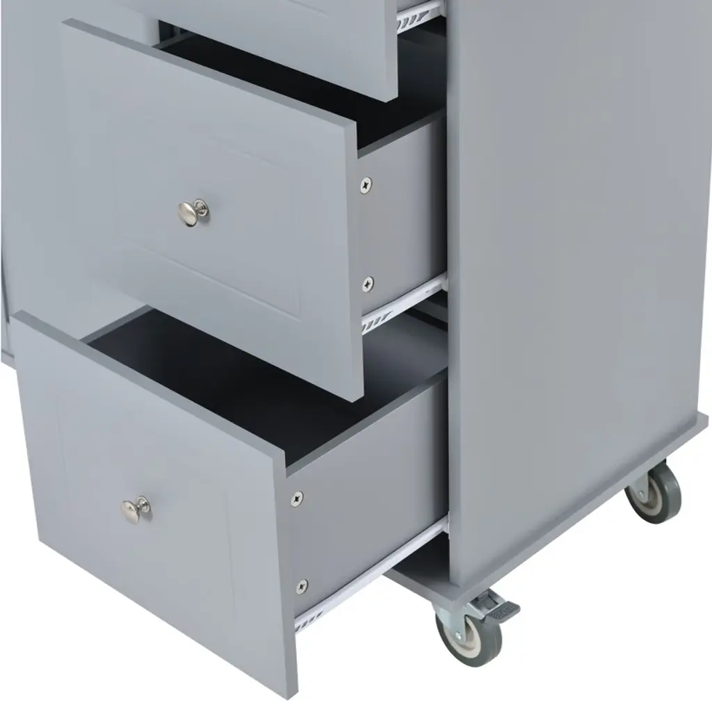 This versatile 52.7-inch rolling kitchen island is designed to enhance your kitchen's functionality and style. The spacious solid wood top provides a durable and expansive surface for all your food preparation needs. As a highly functional kitchen cart with storage, it features a large storage cabinet, three drawers, a spice rack, and a towel rail to keep everything organized. Equipped with locking wheels, this mobile kitchen island with storage can be easily moved and secured safely in place. The convenient drop-leaf breakfast bar offers extra seating or workspace and folds down when not in use. Its classic design makes this kitchen island cart a beautiful and practical centerpiece for any home.