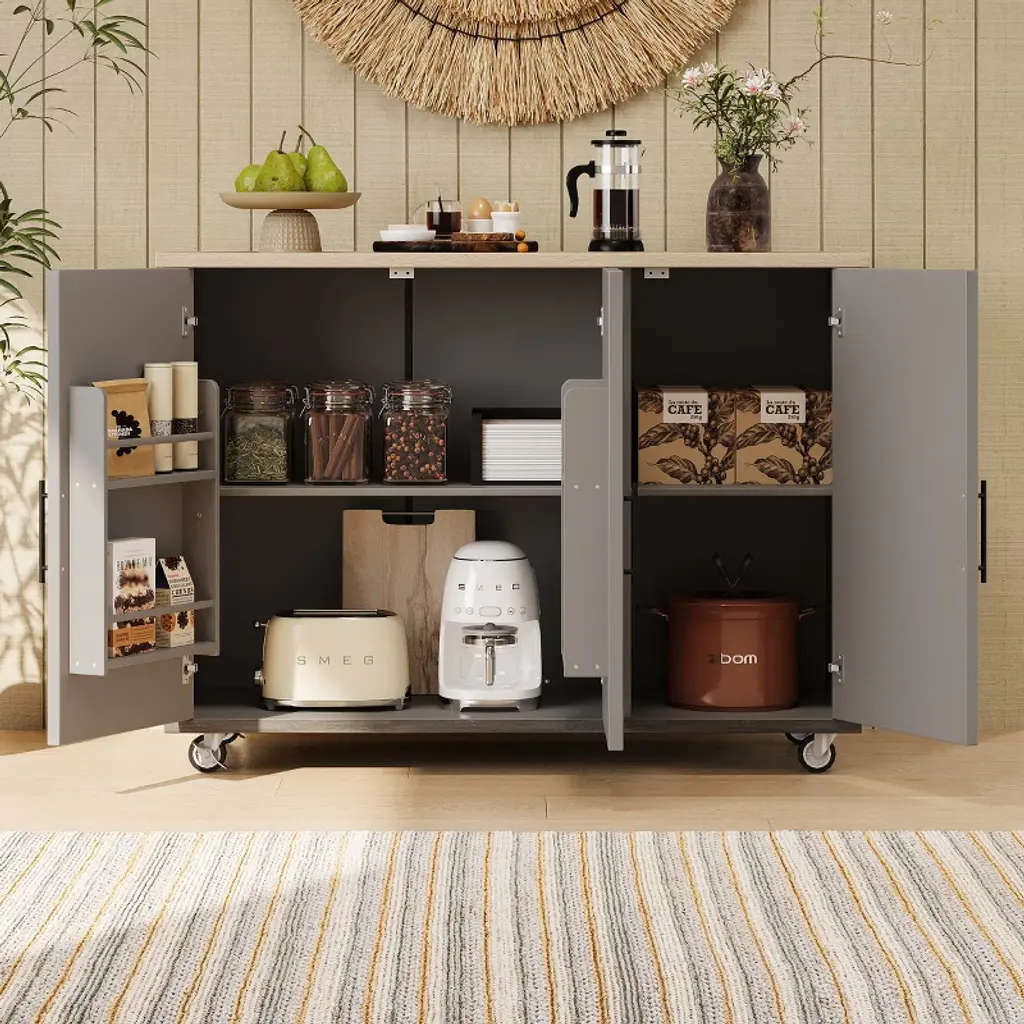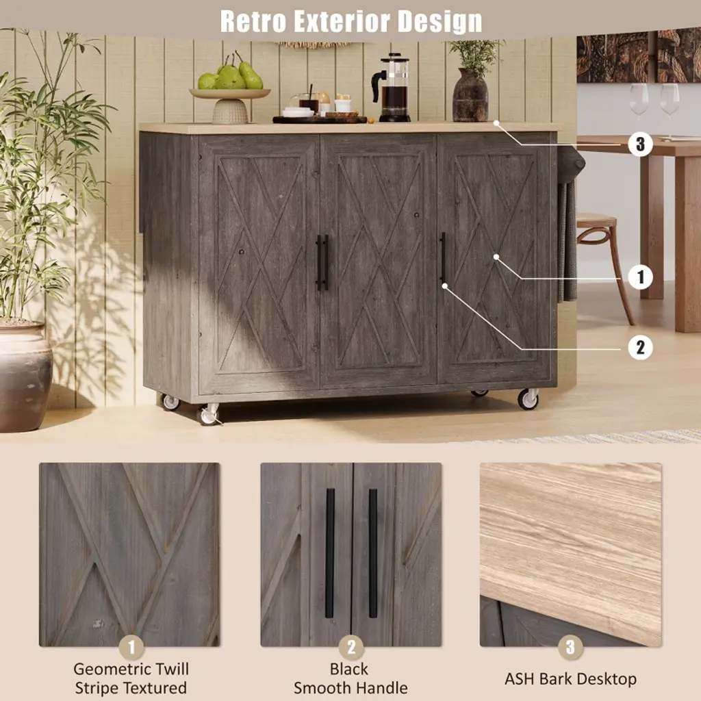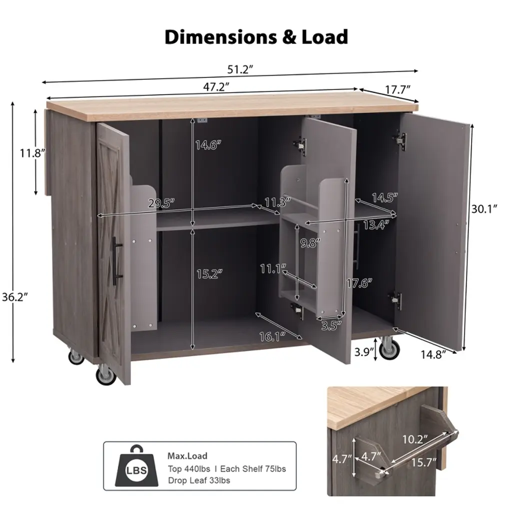 This farmhouse-style indoor kitchen island can bring vintage style and elegance to your kitchen space. It also brings a great degree of convenience to your indoor storage. This product is mainly made of eco-friendly MDF material, paired with the ASH bark material on the surface of the tabletop, which can last for a long time. The overall geometric striped wood grain look is very premium and will make your kitchen eye-catching. In terms of storage space, this kitchen cart has a large 47-inch wide countertop, drop leaf design, a side towel rack, two interior storage shelves and adjustable shelves so you are free to arrange different items as needed. On the bottom of the product, there are four wheels, two of which are lockable, allowing you to move and stop freely. If you need stability, you can also replace the wheels with equipped wooden feet. With this kitchen island, you no longer have to worry about cluttering your kitchen space.