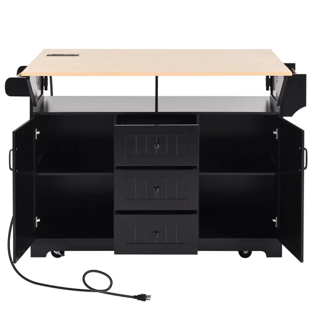 Maliang 55.7'' Large Kitchen Island With 2 Drop Leaf, Power Outlet, Spice & Towel Rack , 3 Drawers, For Kitchen, Dining Room, Black