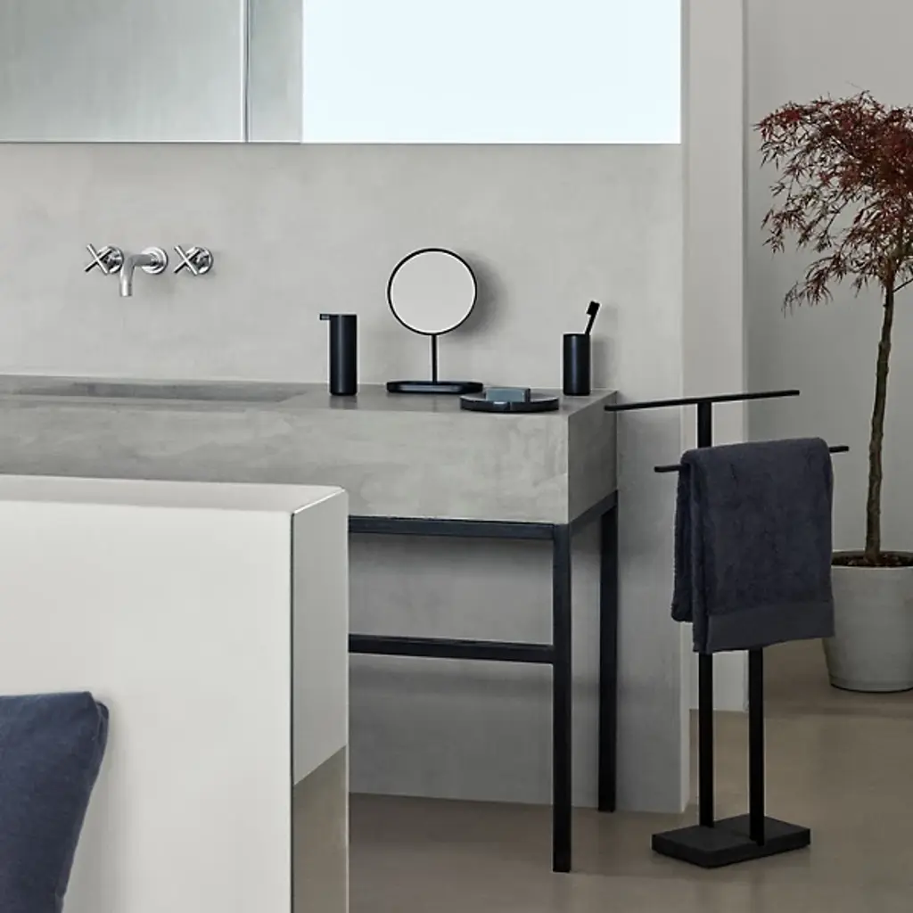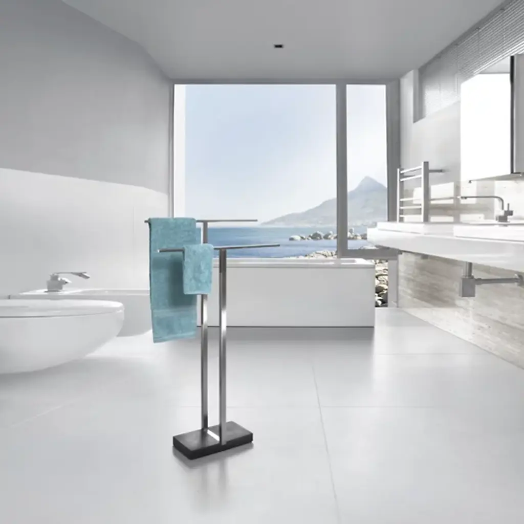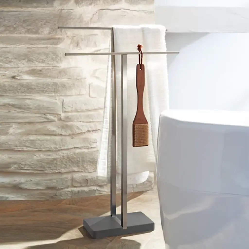 A touch of European elegance, designed to pamper you and your towels. Created by Floz Design, the Blomus MENOTO Towel Stand features two sleek stainless steel towel holders attached to an artificial stone base. The natural, subtle appearance of the graphite-colored base contrasts with the stainless steel, creating a modern, harmonious look.