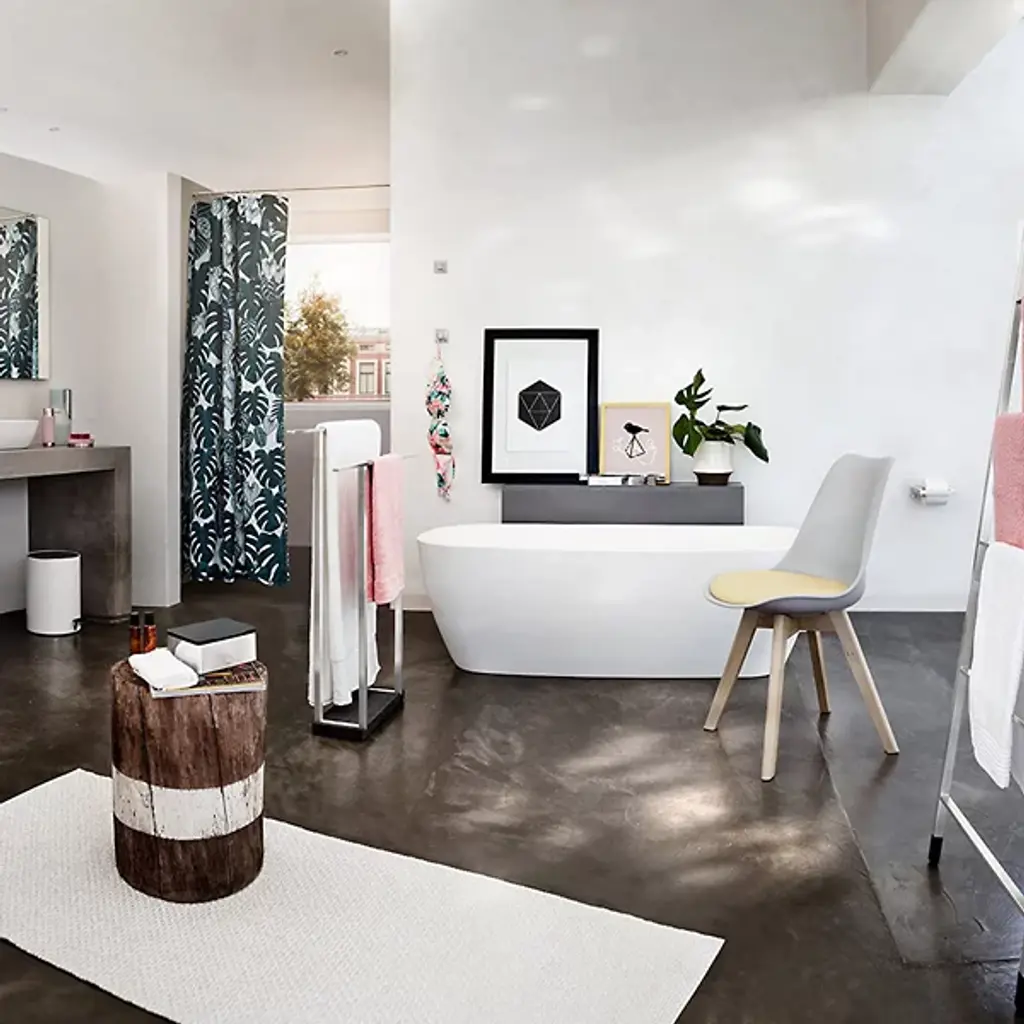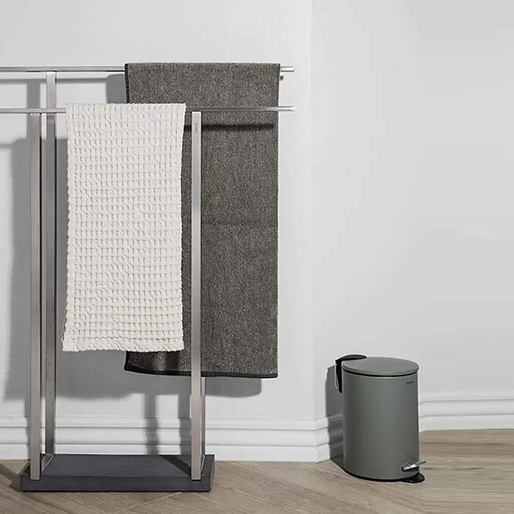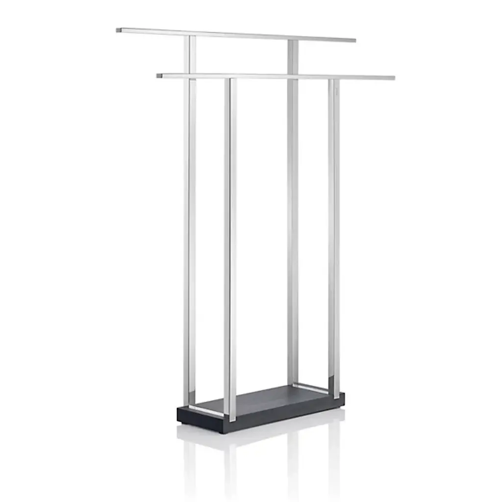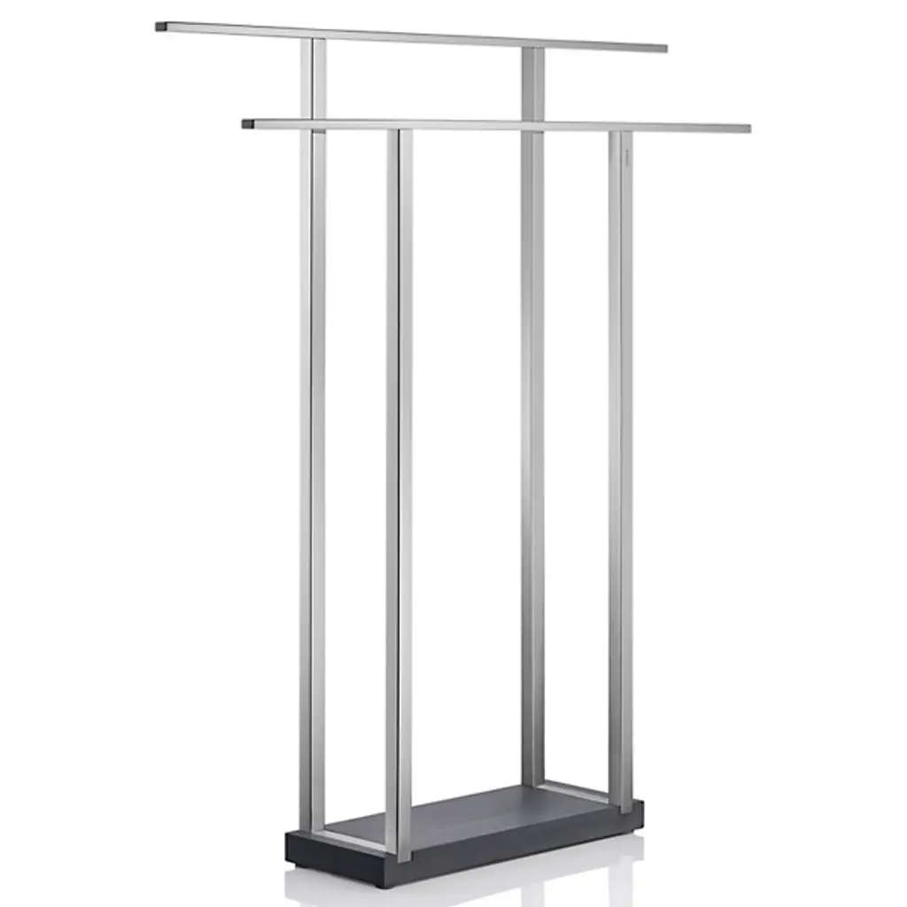 Keep bath towels large and small clean and dry on the Blomus MENOTO Wide Towel Rack. The rack includes two bars more than 2 feet wide. The entire stainless steel structure is complemented by and kept stable with a base made out of heavy, dark grey Polystone.